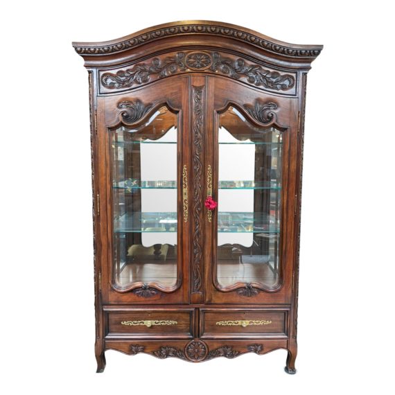 Design Plus Gallery presents Hekman French Provincial Glass Display Armoire. Wood is intricately carved and stained a rich chestnut tone. Hardware is an oiled brass. Interior houses three adjustable glass shelves, mirror back and optional down lighting. Minor wear through out, armoire is in good condition. Includes original key which locks the lower pair of drawers as well. Hand crafted in Grand Rapids Michigan.
