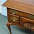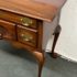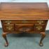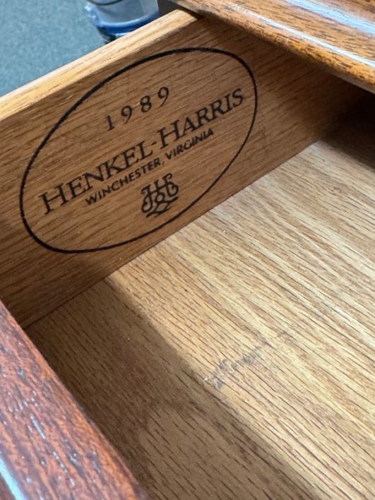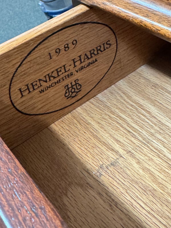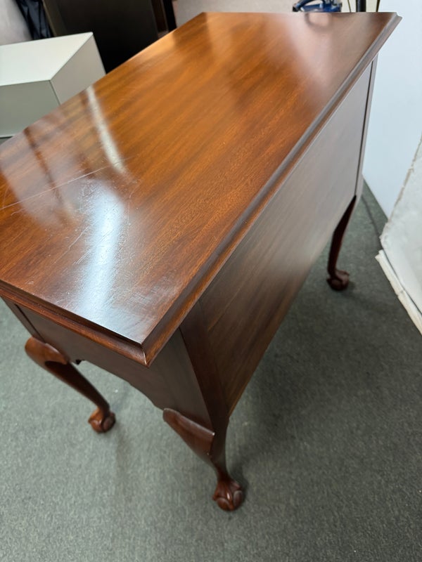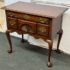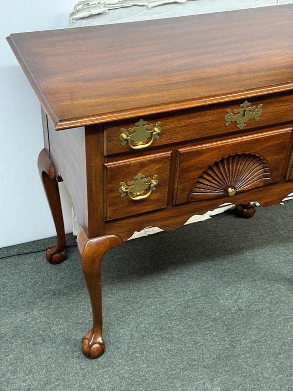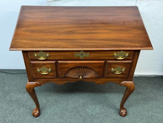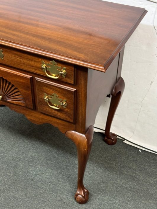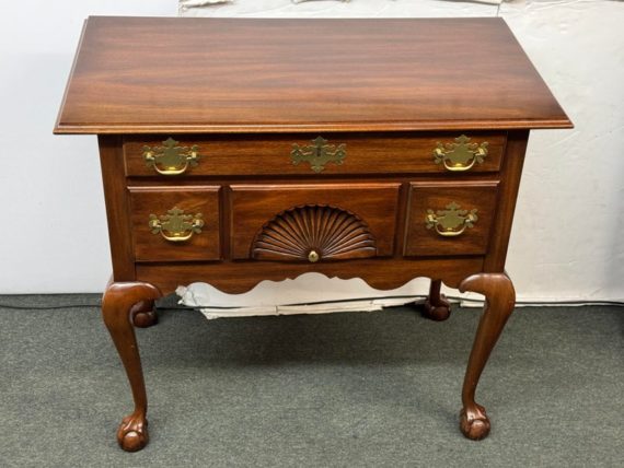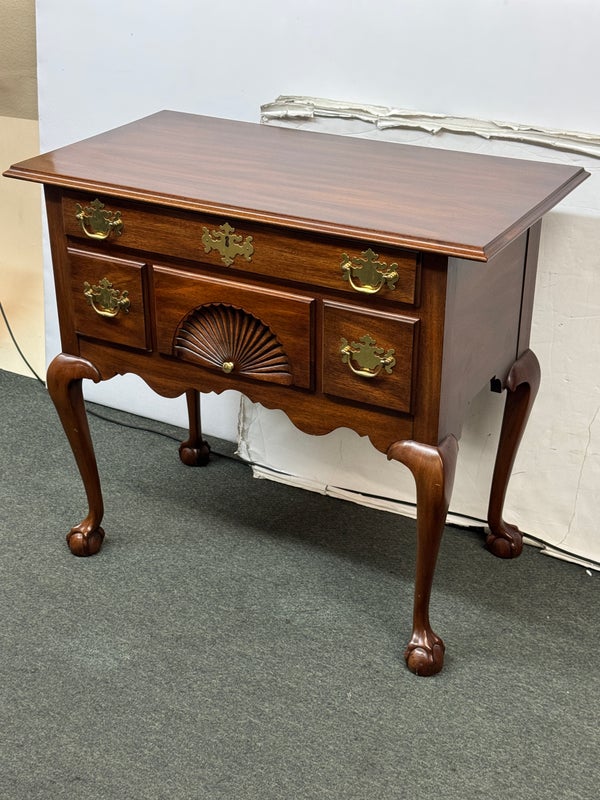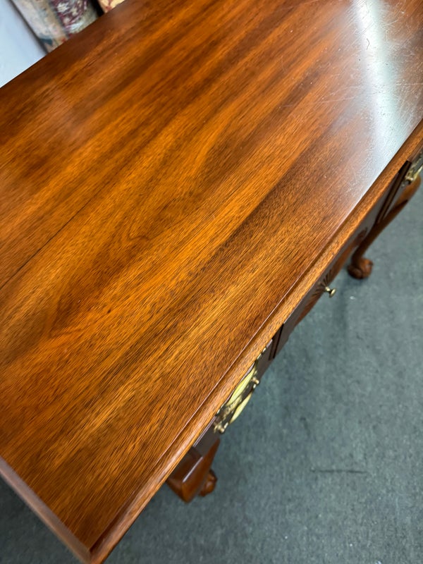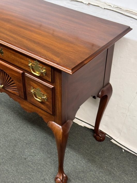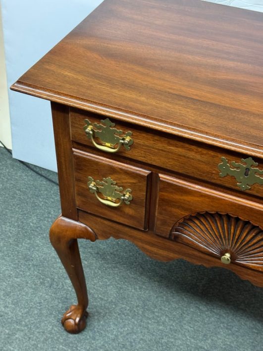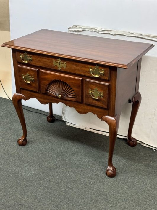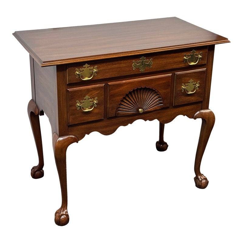 Design Plus Gallery presents a Chippendale Low Boy by Henkel Harris. Lovely cabriole legs elevate the mahogany case with four useful drawers and a beautiful woodgrain surface, with brass fittings. Light surface wear; condition is good for age and use.