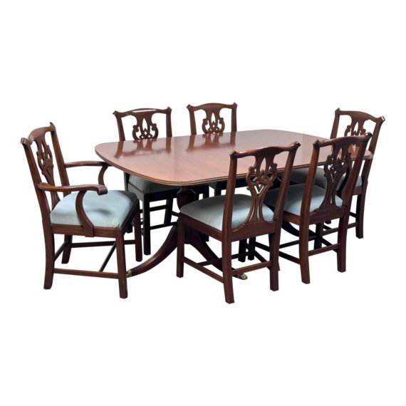 Design Plus Gallery presents a Traditional Mahogany Dining Room Table by Henkel Harris. The extension table, Model #2208, is made of solid mahogany from the late 20th Century. The rectangular top sits on two pedestals, each with three fluted legs with brass paw toe caps, and four extension leaves. Provenance is included on the underside of table. The table does have handsome set of six Henkel Harris 1025 mahogany chairs with Bank Heron Soft Blue Velvet and are in the same traditional tone with back harp detail that matches dining table to perfection. All items are in good condition with. minimal wear for their vintage age + use. The set comes with velvet lined pads to protect the table surface from damage when not in use. All made in the United States.