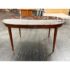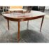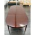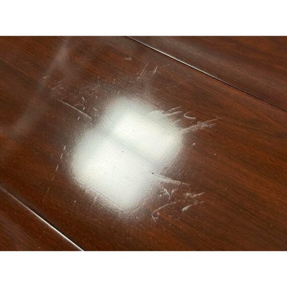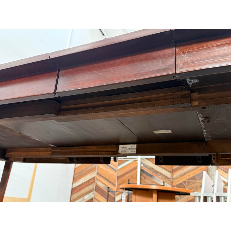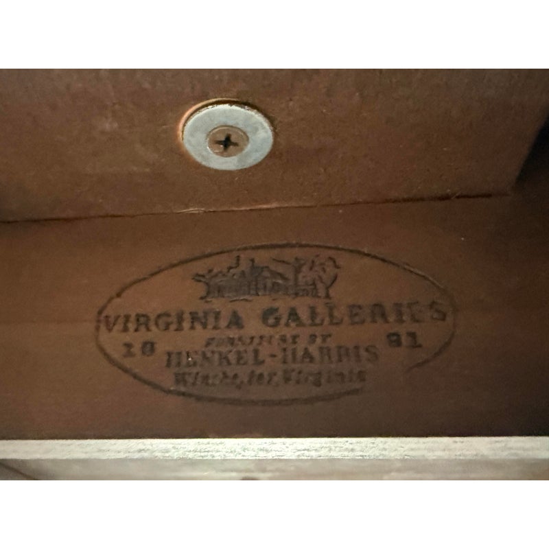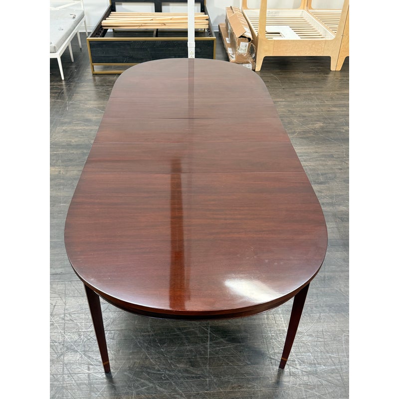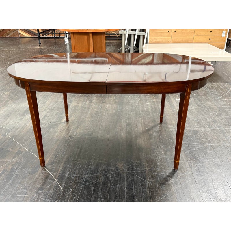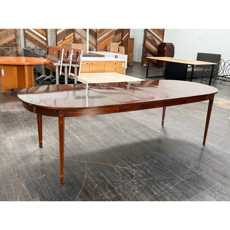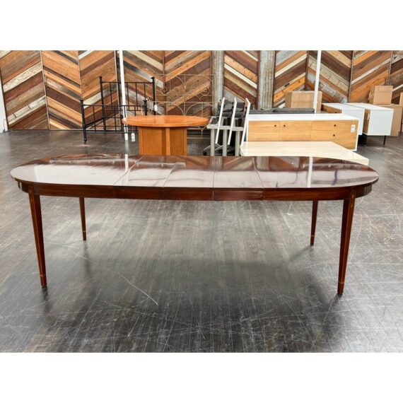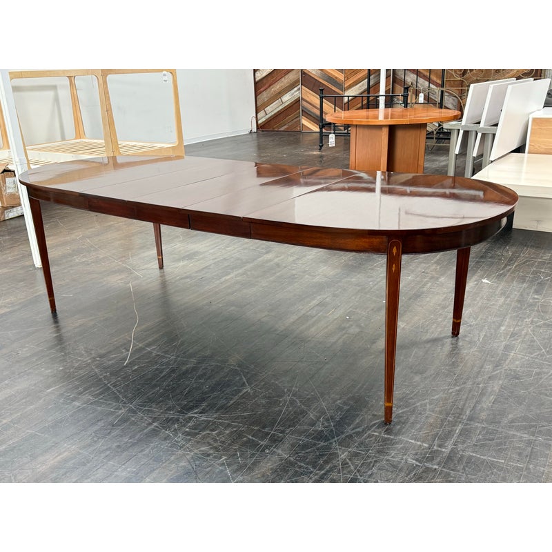Design Plus Gallery presents a Mahogany Federal-Style Extension Dining Table from Henkel-Harris Virginia Galleries. This elongated table shows the brand’s traditional approach with rounded ends, tapered legs, and contrasting inlay accents that define the leg posts. The top extends with three extensions, allowing the silhouette to shift from a compact oval form to a longer dining surface while maintaining continuity through the apron and edge banding. The glossy mahogany surface and classic lines give the piece a formal presence, and the maker’s stamp underscores its legacy within the Henkel-Harris line. One extension apron was broken off and was repaired. This is a discontinued model with the brand and is in good condition with visible and minimal wear from usage.