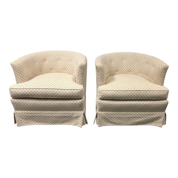 Design Plus Gallery presents a Pair of Chairs by Henredon. A low barrel back design with tufted backing. Upholstered in a geometric neutral color fabric. Label under loose cushions.” Henredon Fine Furniture. Circa ’60”. A skirted base hides wood legs with casters. Easy to move around the room. Seat Height: 17 inches
