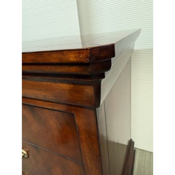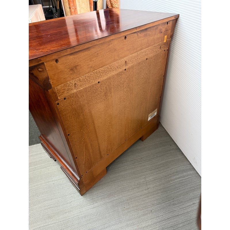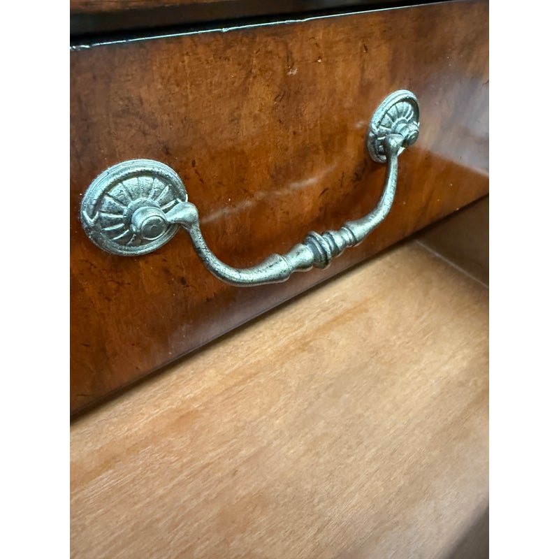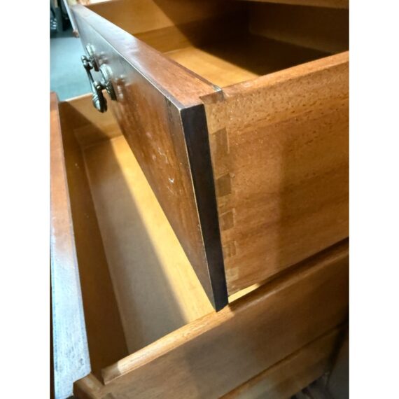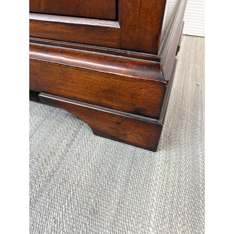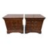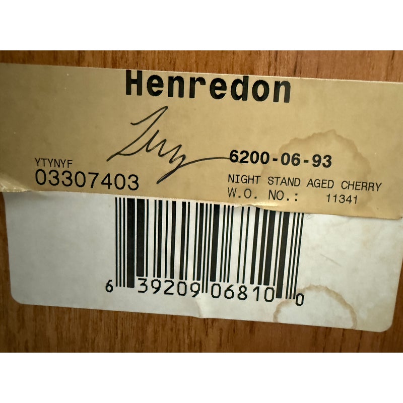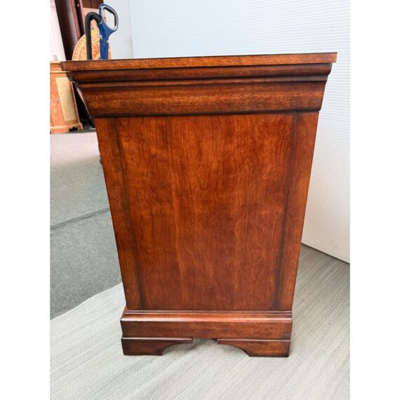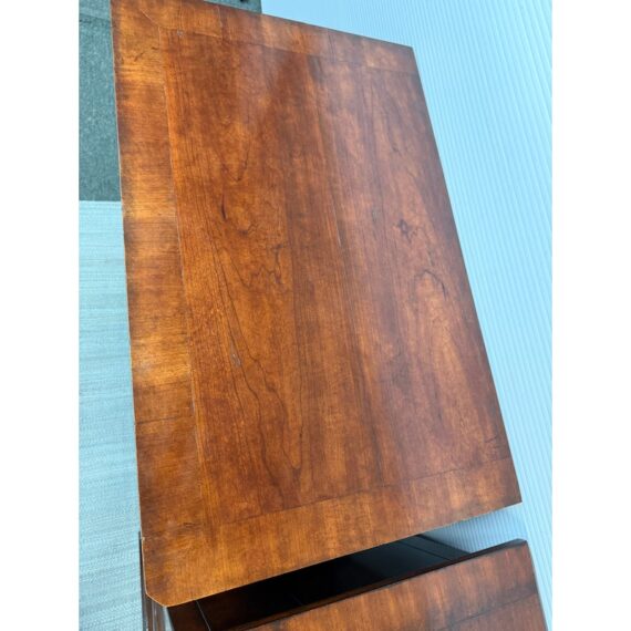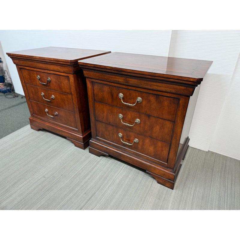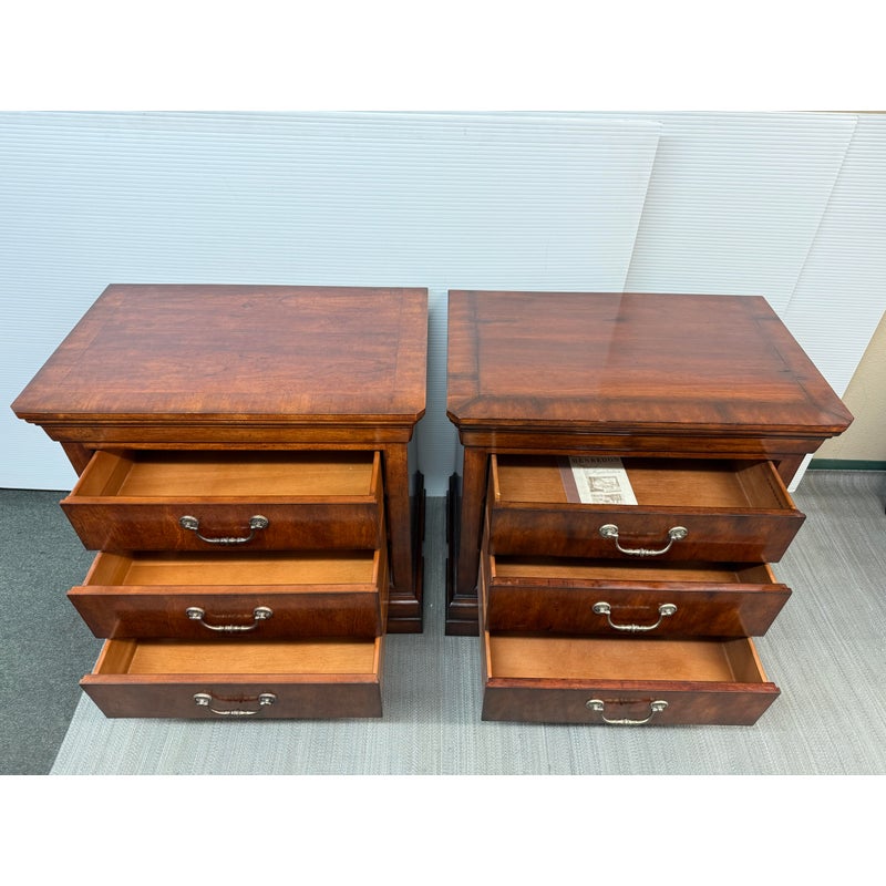 Design Plus Gallery presents a stunning pair of Cavalier Night Stands from Henredon. These bed side tables are naturally distressed with cherry wood grain with the Louis Philippe styling.This style is characterized by its simple, sturdy, and functional design, often with clean lines, rounded edges, and minimal decoration. Each nightstand has features including dovetailed drawers, three dovetailed drawers with original cast brass shield hardware, and low bracketed feet. Light surface wear; condition is good for age and use.