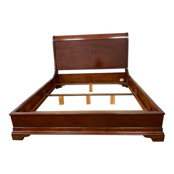 Design Plus Gallery presents a King Mahogany Sleigh Bed Frame. Rich stain is smoothing satin finished on the moldings and curvature of solid wood construction. Comes with modified slats for supporting a box frame and mattress. Minor wear on wood surfaces.