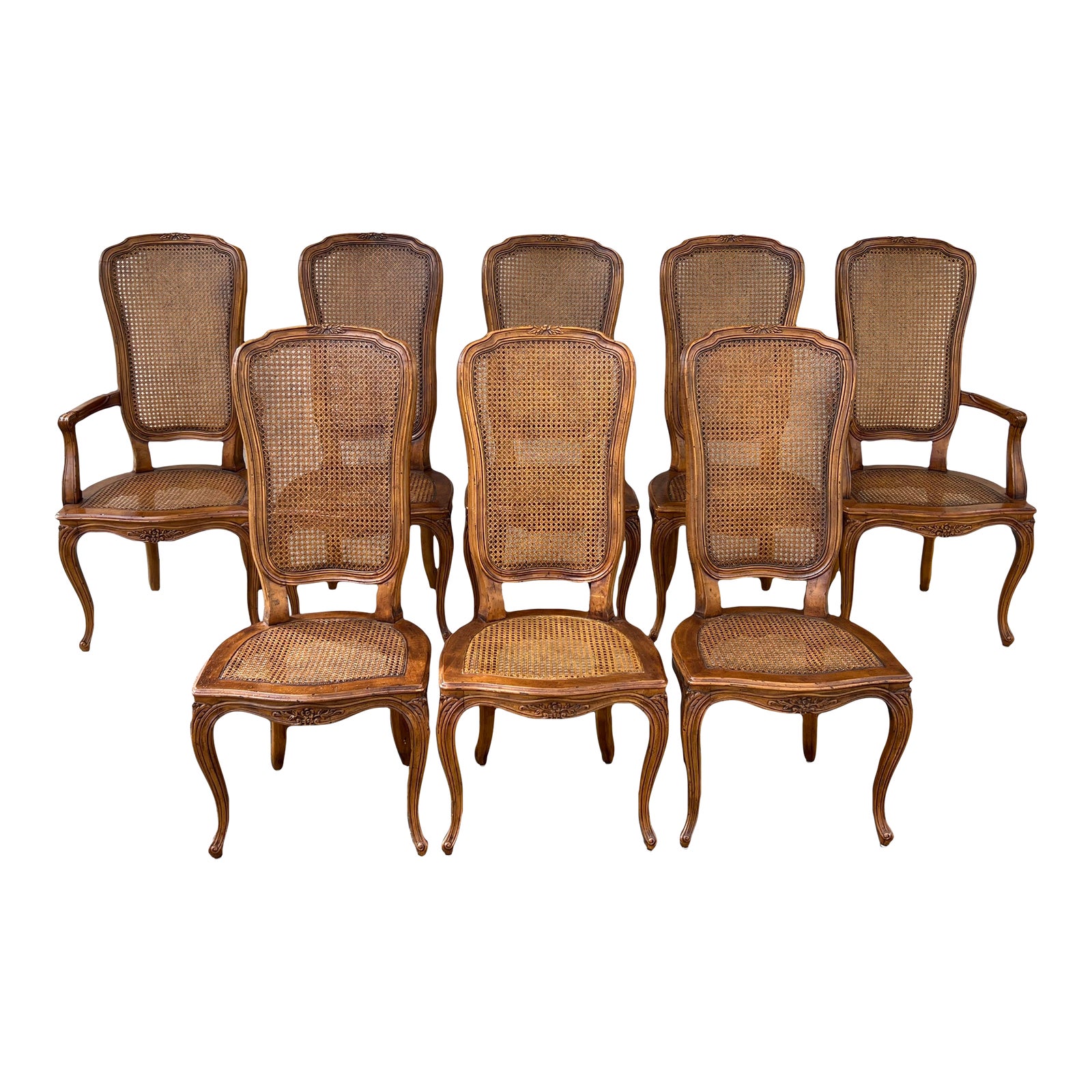 Design Plus Gallery presents a Vintage Set of 8 French Country Chairs by Henredon. Lovely scaled high-back, cabriole legged chairs are framed in beveled wood with carved flourishes. The back and seat are inset with well-maintained caning. Two armchairs + six side chairs for your large gathering. Light evidence of surface wear; condition is good for age and use.