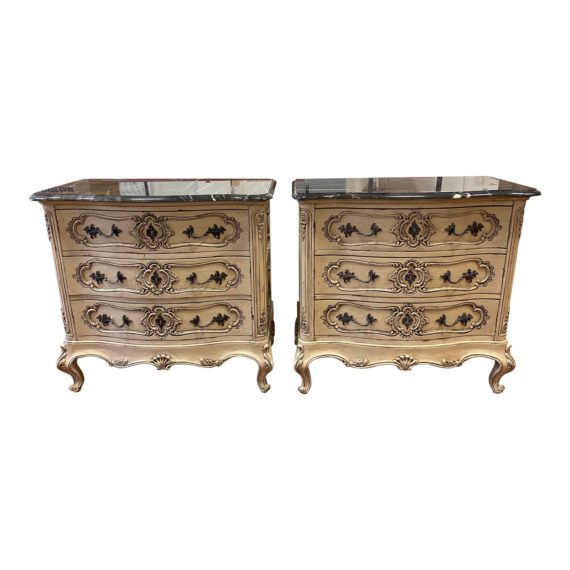 Henredon Marseilles Marble Top French Provincial Three Drawer Dresser – a Pair. Original Price: $8,000