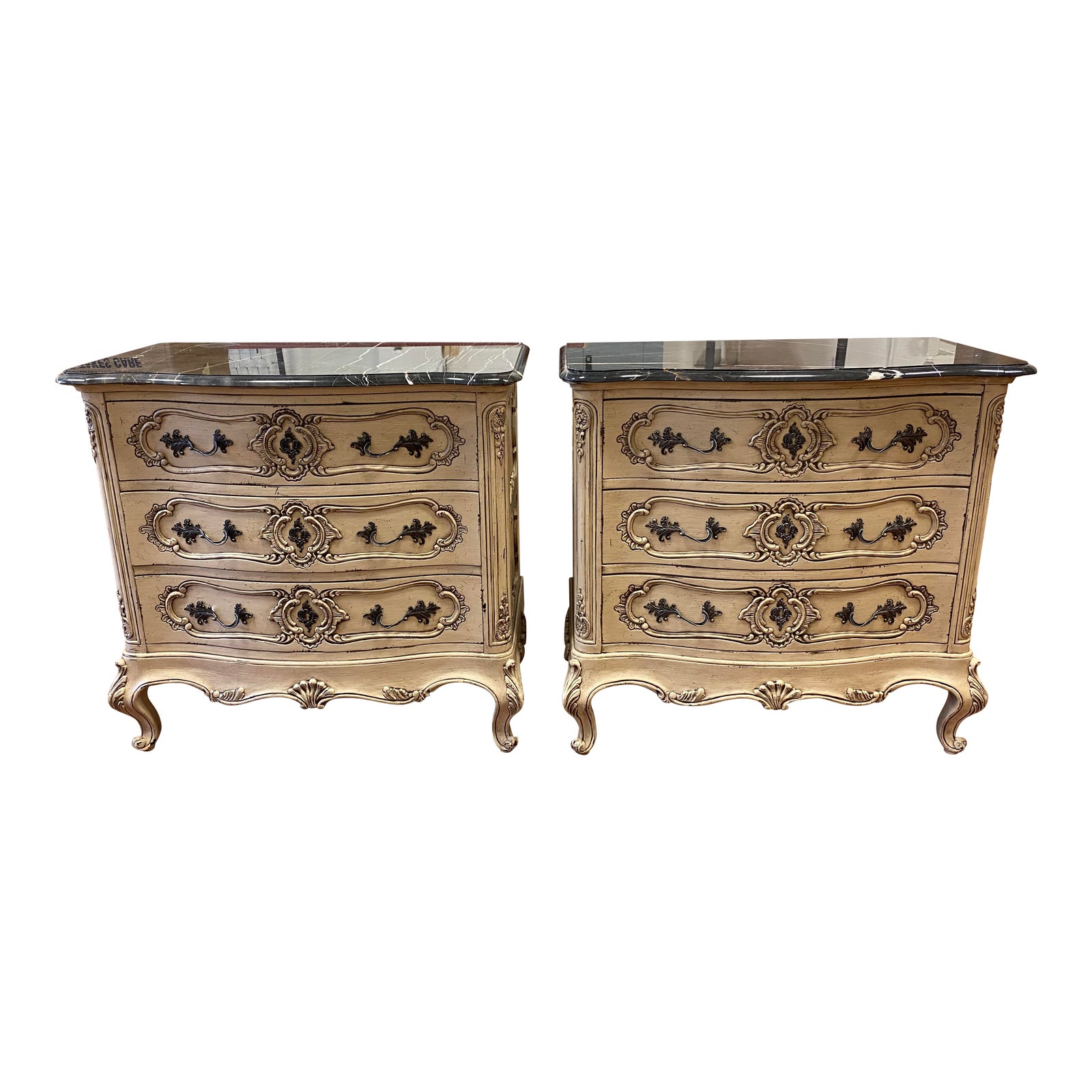 Design Plus Gallery presents a pair of Marble Top French Provincial Three Drawer Dressers. French Provincial wood frames are applied with an antiqued wash of cream paint with rubbed out edges along the intricate carvings for contrast. Oiled black brass pulls accentuate the contrast and curvature of these forms. Each unit comes with three drawers equal in size constructed in maple. Tops are finished with a sharp green and black marble with white veins running throughout. Marble edges have a soft bevelled curvature. Minor wear on the frame and top.