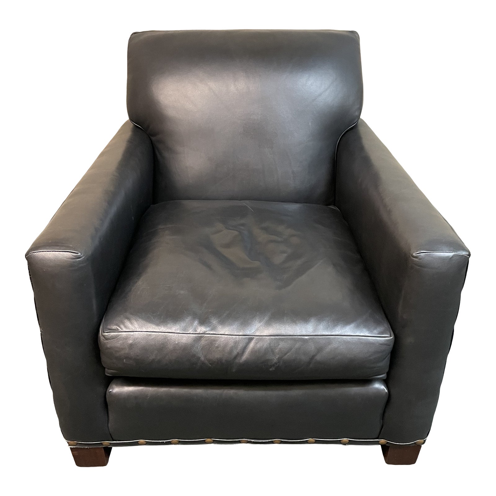 Design Plus Gallery presents the Brentwood chair by Ralph Lauren. Manufactured by Henredon, the black leather club chair As contemporary updates. Tight back and clean mind track arms replace the tufting and rolled arm of yore. Oversized brass nail heads and leather banding is the chairs only embellishment. Dark stained block feet Support this comfortable chair.