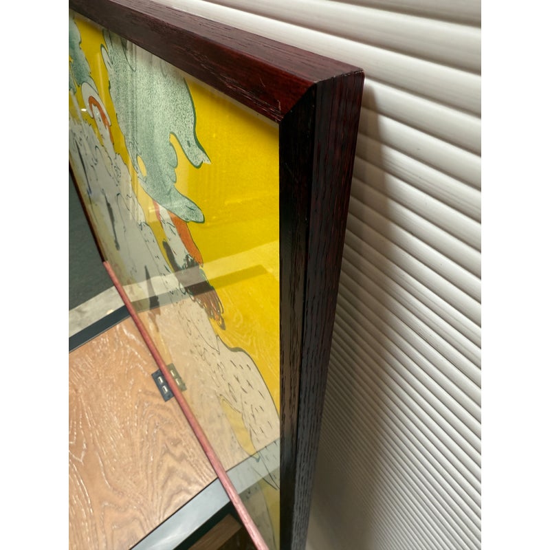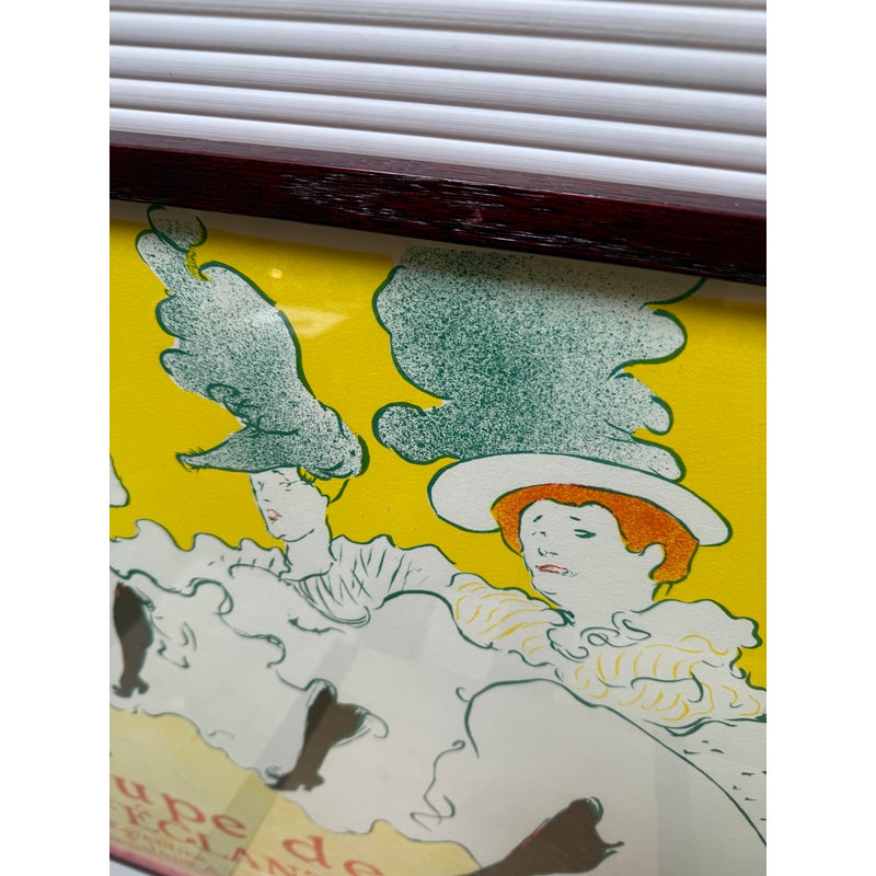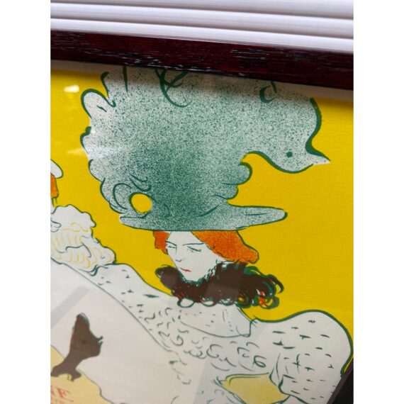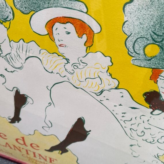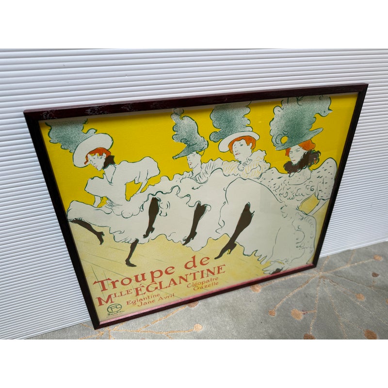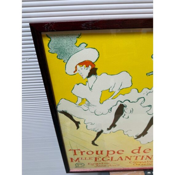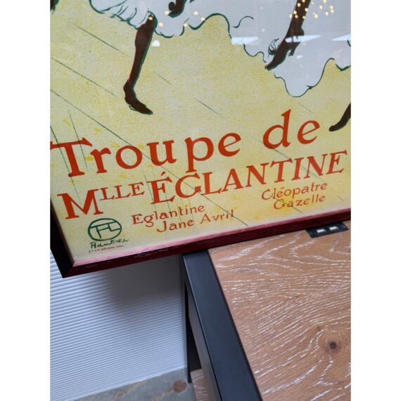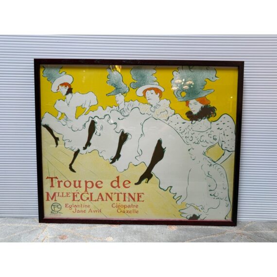 Design Plus Gallery presents La Troupe De Mademoiselle Eglantine by Henri De Toulouse-Lautrec. This lithograph is printed in three colors on machine paper and its original incarnation was used in the late 1890’s. A professional dancer, Jane Avril, traveled to London as part of the Troupe d’Églantine, to perform at the Palace Theatre. A few days before the Troupe took to the London stage, she commissioned a poster from Henri De Toulouse-Lautrec back in Paris to advertise the performances. Lautrec described the quartet as an “apotheosis of the Moulin Rouge”, which may suggest that he saw them perform at the iconic Montmartre club. Lautrec singled out his friend Avril, placing her at the front of the row of women. While her fellow performers appear in an ordered line, their raised legs at a uniform height, Avril’s dance is far freer. Her red hair stands out against her blonde companions. The lithograph is in good condition for its age + use.