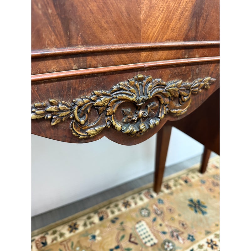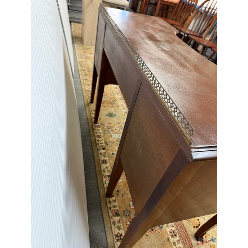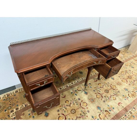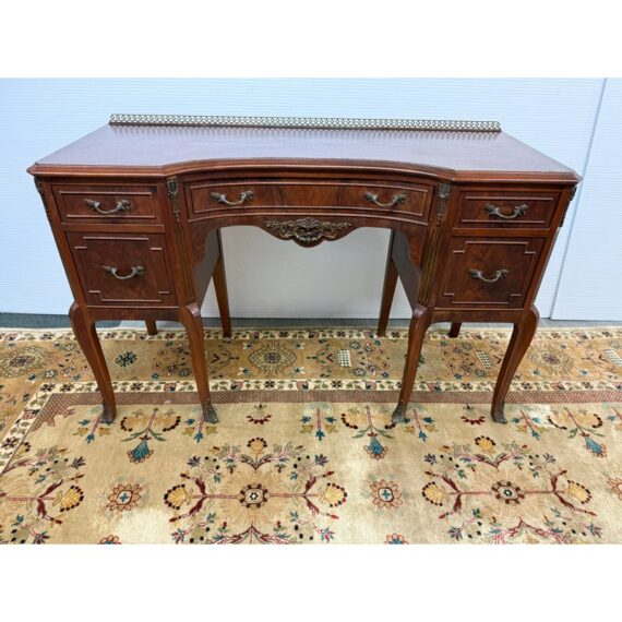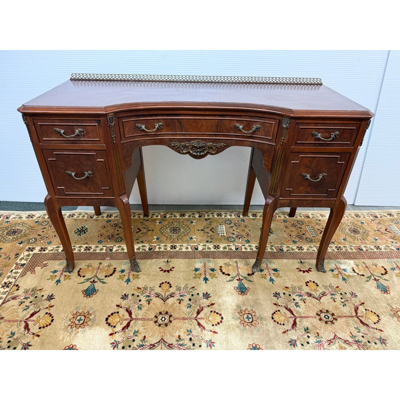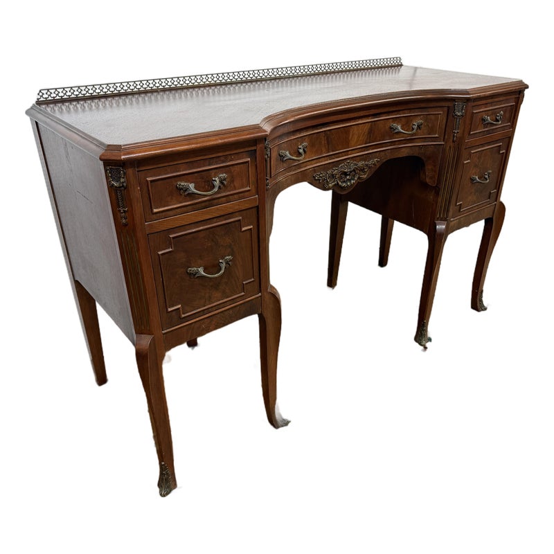 Design Plus Gallery presents a Cherry Wood Writing Desk and/or Vanity with Brass Gallery by Henry C. Steul & Sons. The brand was a high-quality furniture manufacturer operating out of Buffalo, New York, known for producing fine, handcrafted reproductions of Early American, William & Mary, and Jacobean styles during the 1920s and 1930s. The desk doubles as a modern-day vanity with pizzazz considering it numerous objects of decorative flair. The tabletop is shaped with an opening for you to sit comfortably under and has an etched brass gallery across its backside. There are swan neck handles, numerous brass ormolu mounts, and cabriole legs to create a refined and sophisticated workspace. There is one single center drawer and two staggered depth drawers on either side with one of these bearing the metal shield from the brand. It is in good condition with signs of wear within the drawers that is standard for its near antique usage. Made in the USA.