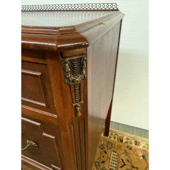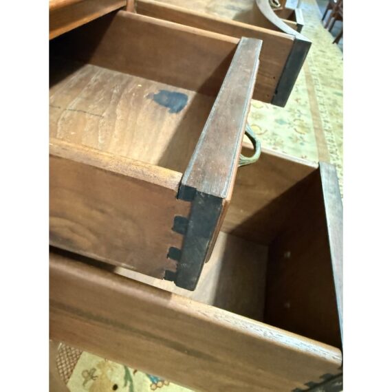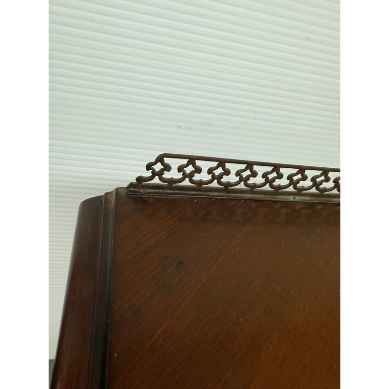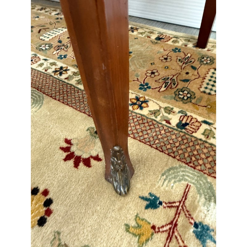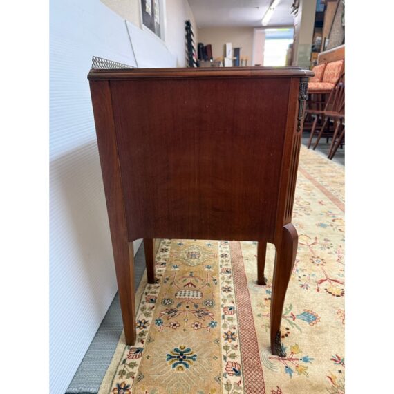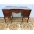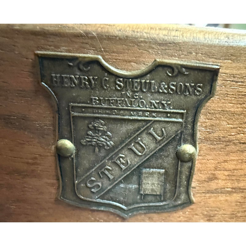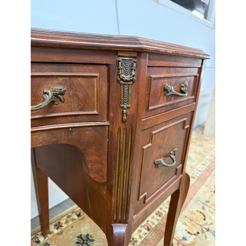 Design Plus Gallery presents a Cherry Wood Writing Desk and/or Vanity with Brass Gallery by Henry C. Steul & Sons. The brand was a high-quality furniture manufacturer operating out of Buffalo, New York, known for producing fine, handcrafted reproductions of Early American, William & Mary, and Jacobean styles during the 1920s and 1930s. The desk doubles as a modern-day vanity with pizzazz considering it numerous objects of decorative flair. The tabletop is shaped with an opening for you to sit comfortably under and has an etched brass gallery across its backside. There are swan neck handles, numerous brass ormolu mounts, and cabriole legs to create a refined and sophisticated workspace. There is one single center drawer and two staggered depth drawers on either side with one of these bearing the metal shield from the brand. It is in good condition with signs of wear within the drawers that is standard for its near antique usage. Made in the USA.