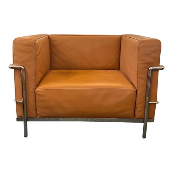 Design Plus Gallery presents a Pair of Hercules Chair by Flash Furniture. Upholstered in a Cognac LeatherSoft Upholstery. This trendsetting piece features a straight arm design and removable seat cushions,. LeatherSoft is leather and polyurethane for added softness and durability. A stainless steel frame, accent bar enclosure and integrated legs give these chairs added strength and a distinctive flair. Visible and minor wear from usage. Made in Italy.