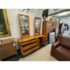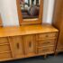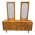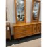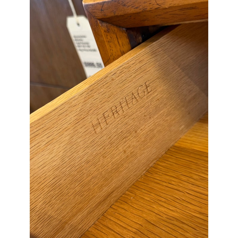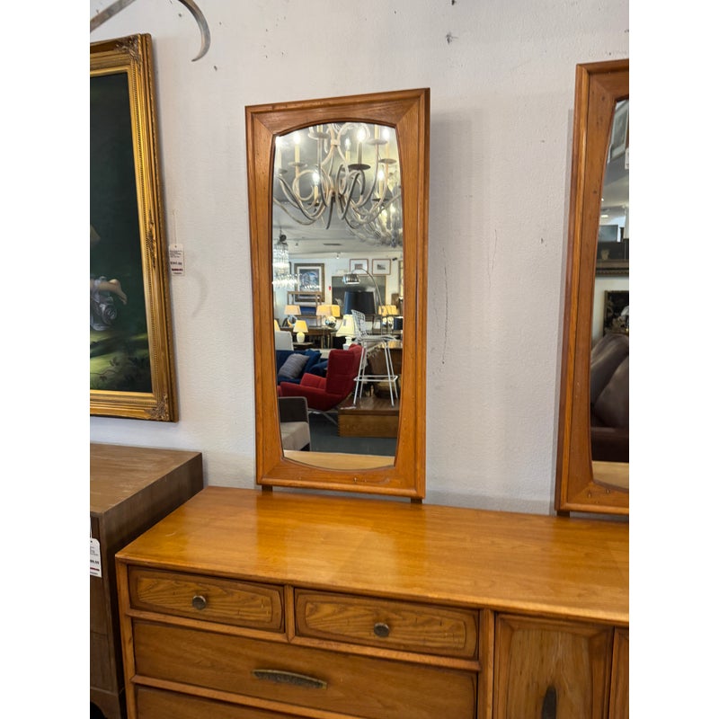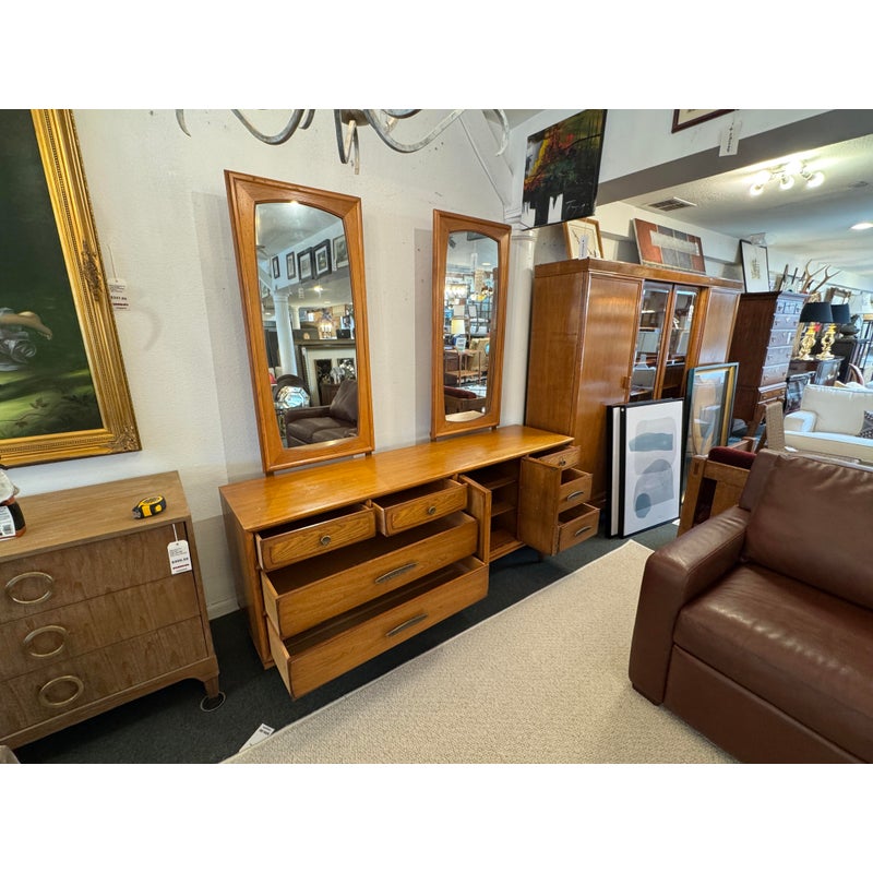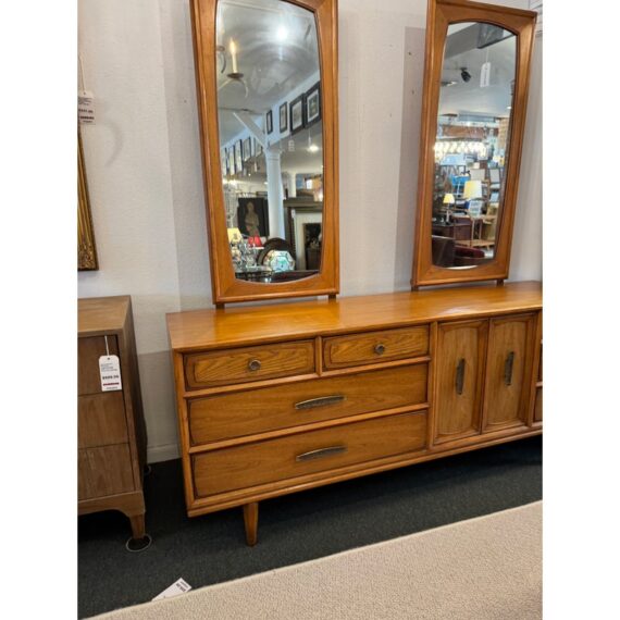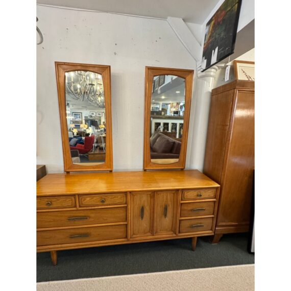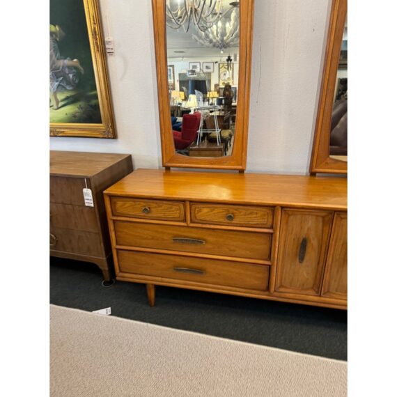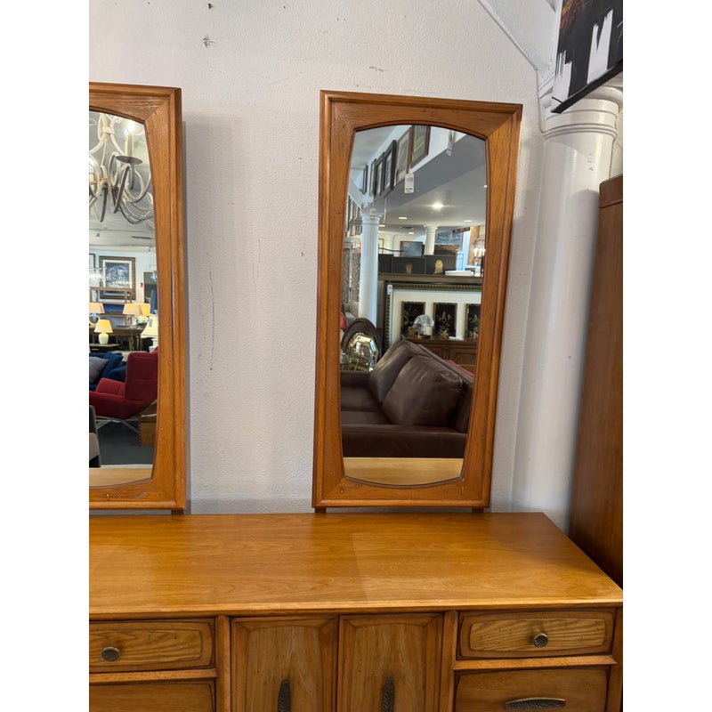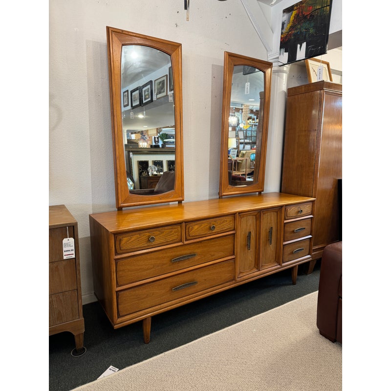 Design Plus Gallery presents a Mid-Century Dresser with Dual Mirrors from Heritage. This long-profile case piece shows the balanced lines and tailored geometry associated with the period, with a linear drawer arrangement, central cabinet doors, tapered legs, and coordinating mirror frames. The wood grain brings depth across the drawer fronts and cabinet panels, while the original hardware adds contrast and definition. The pair of mirrors echo the dresser’s silhouette and complete the set with a cohesive look. This is a discontinued model from the brand and is in good condition with visible and minimal wear from usage. Made in the USA.