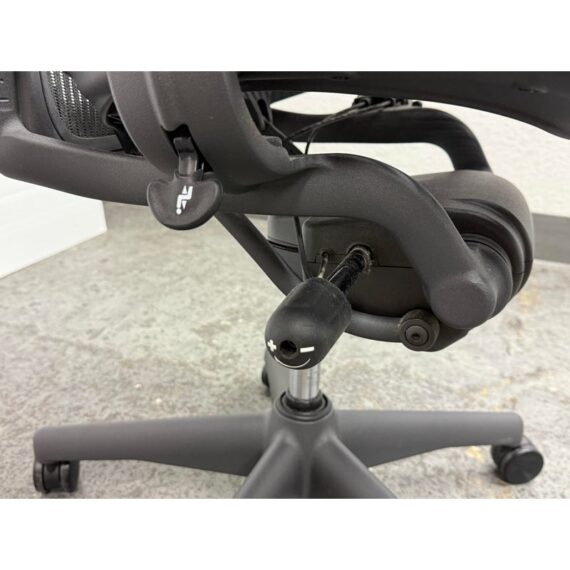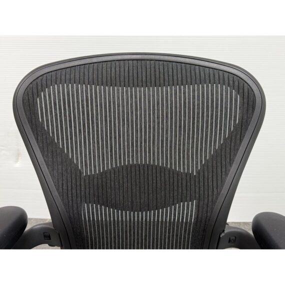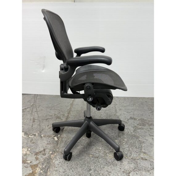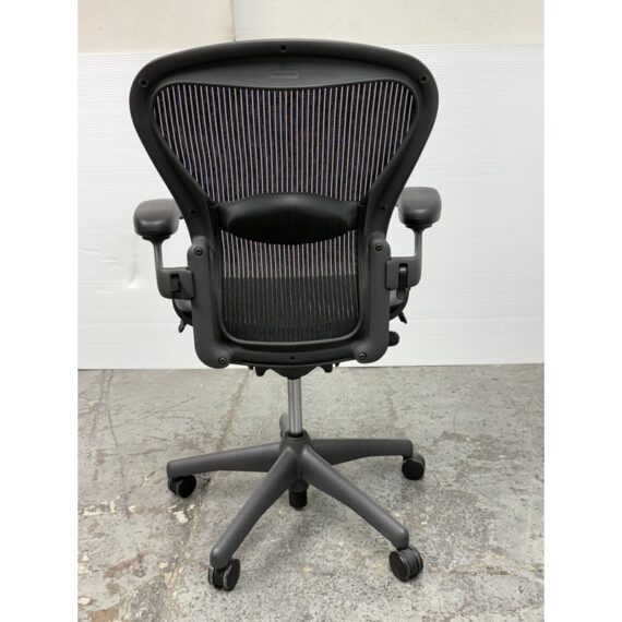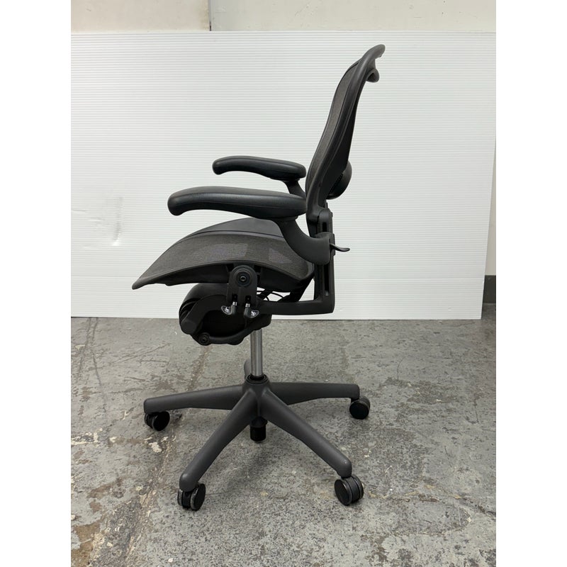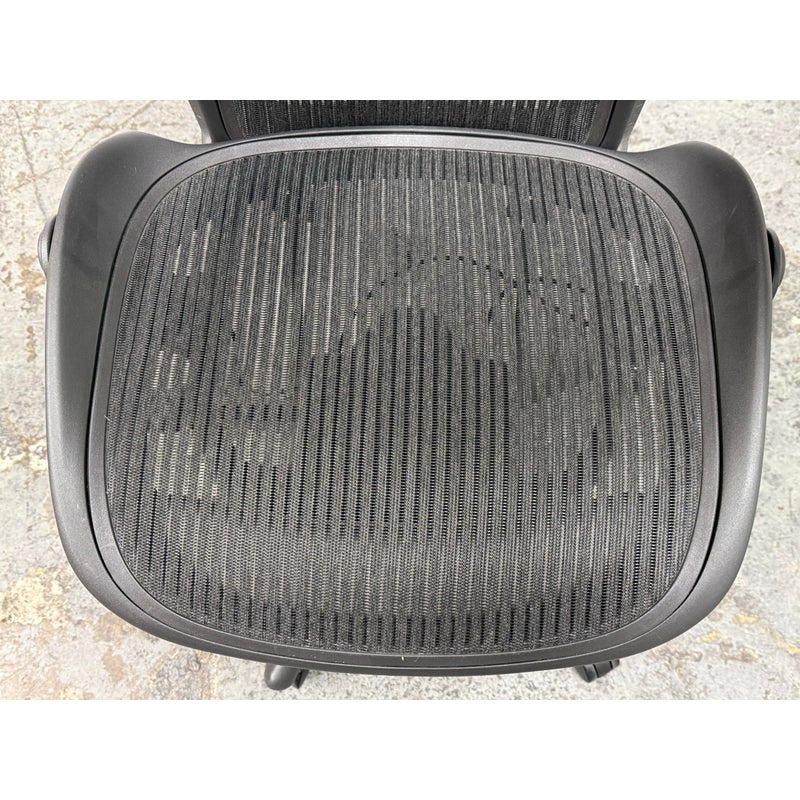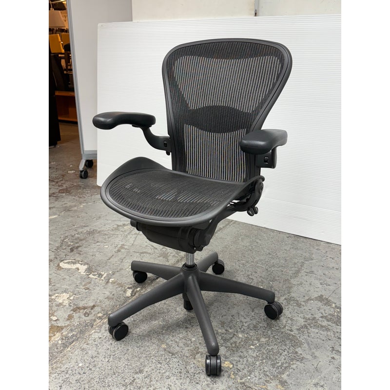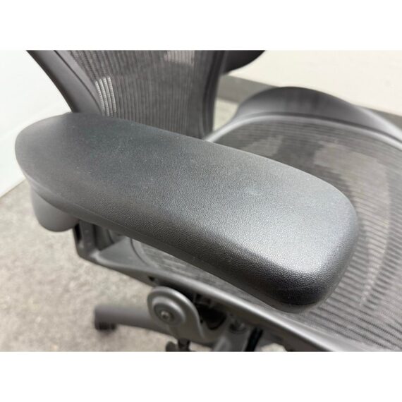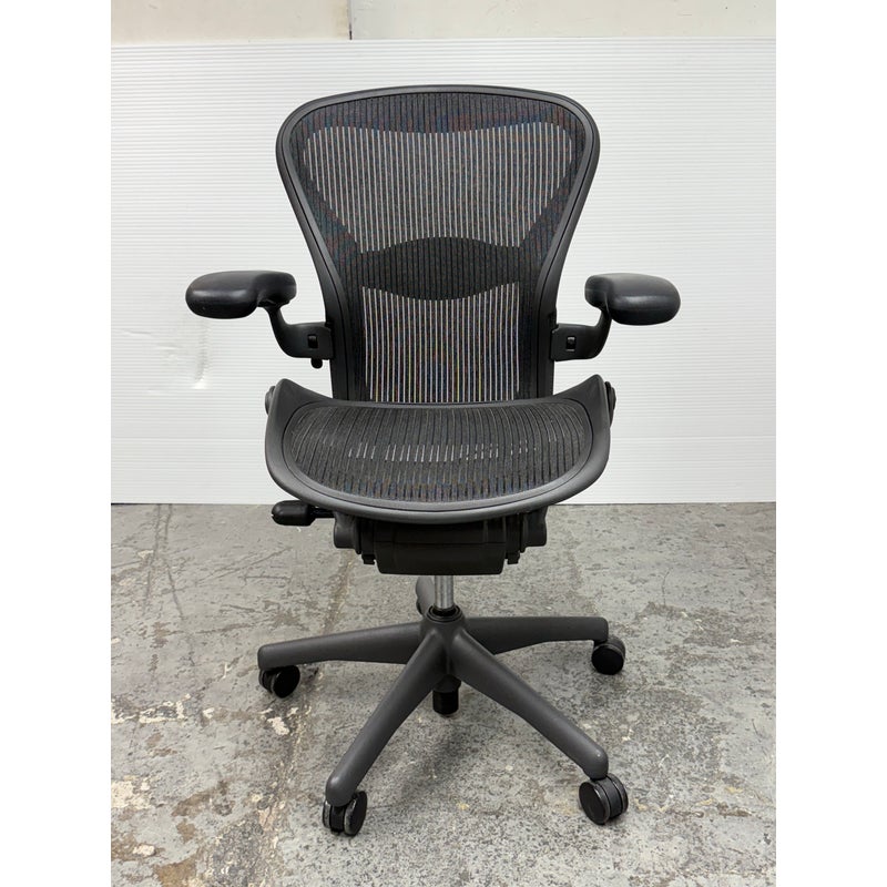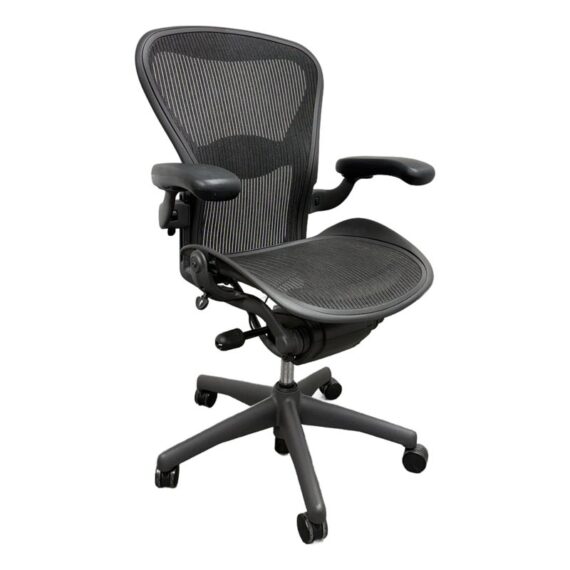 Design Plus Gallery presents an Aeron office Chair Size “B” from Herman Miler. Adjustable features have been thoughtfully designed for intuitive adjustment capabilities. Carbon framing, vinyl arm pads, breathable mesh all work in conjunction with each other with tension control, rear tilt locking, adjustable lumbar support and height. In good condition, visible and minimal wear from usage. Made in USA.