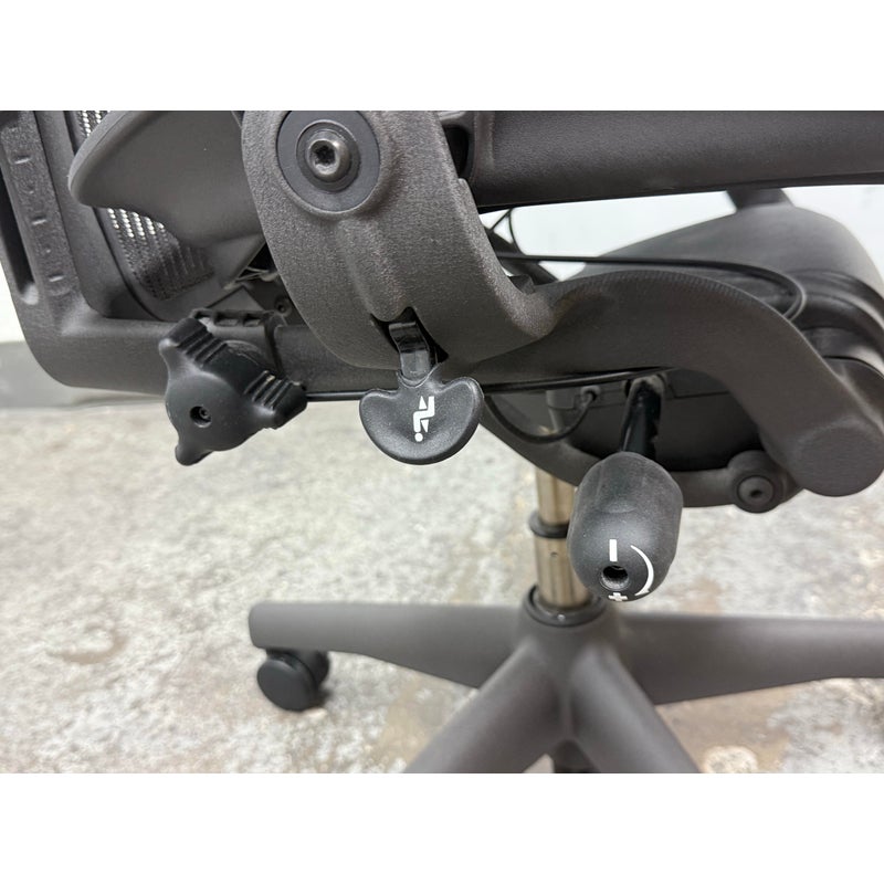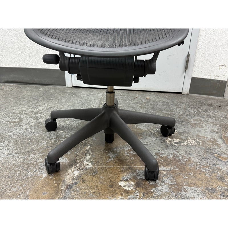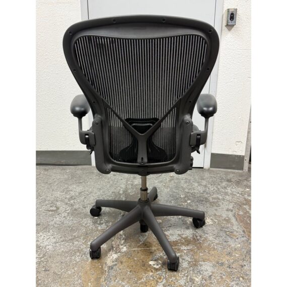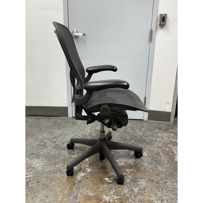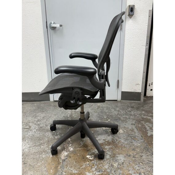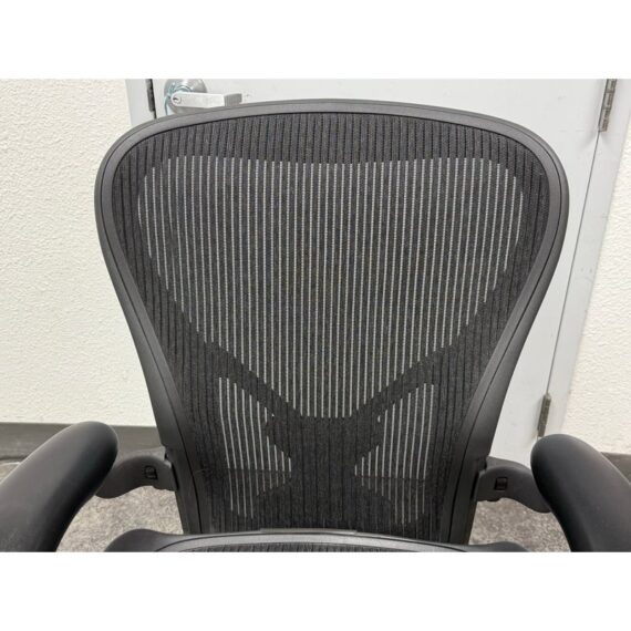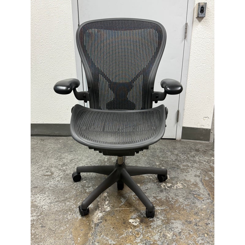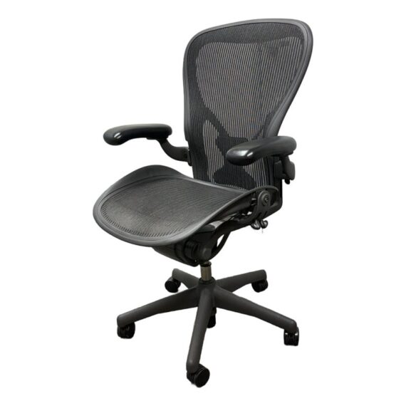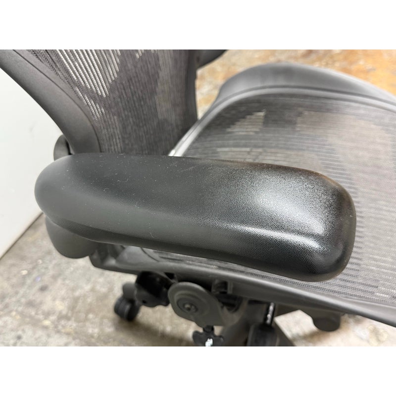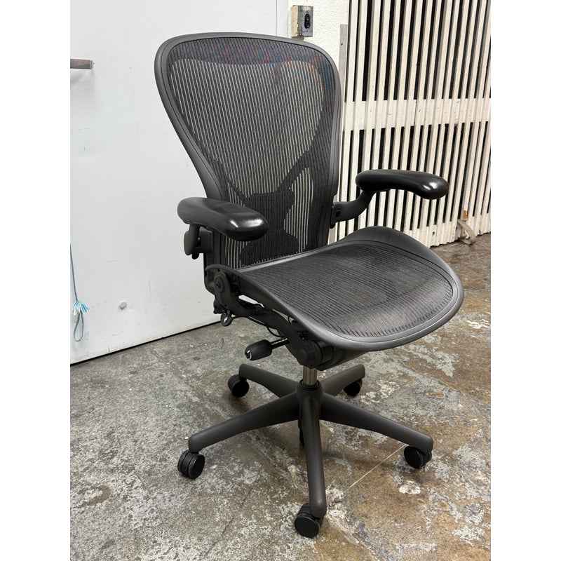Design Plus Gallery presents an Aeron office Chair Size “C” from Herman Miler. Adjustable features have been thoughtfully designed for intuitive adjustment capabilities. Carbon framing, vinyl arm pads, breathable mesh all work in conjunction with each other with tension control, rear tilt locking, adjustable lumbar support and height. In good condition, visible and minimal wear from usage. Made in USA.