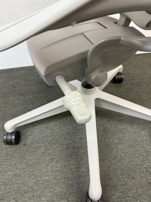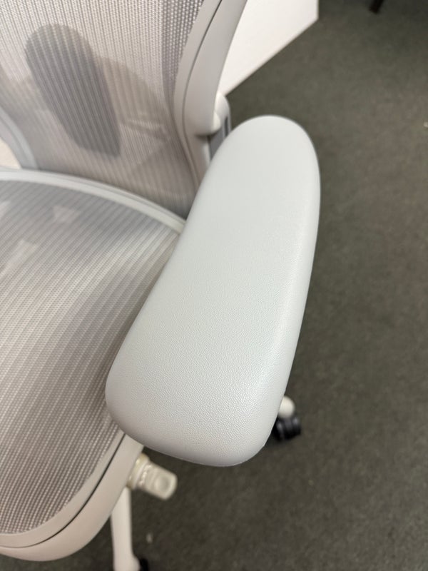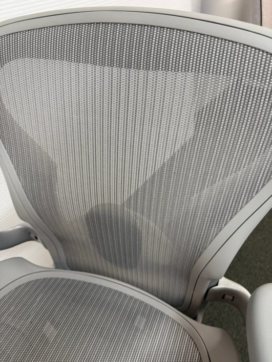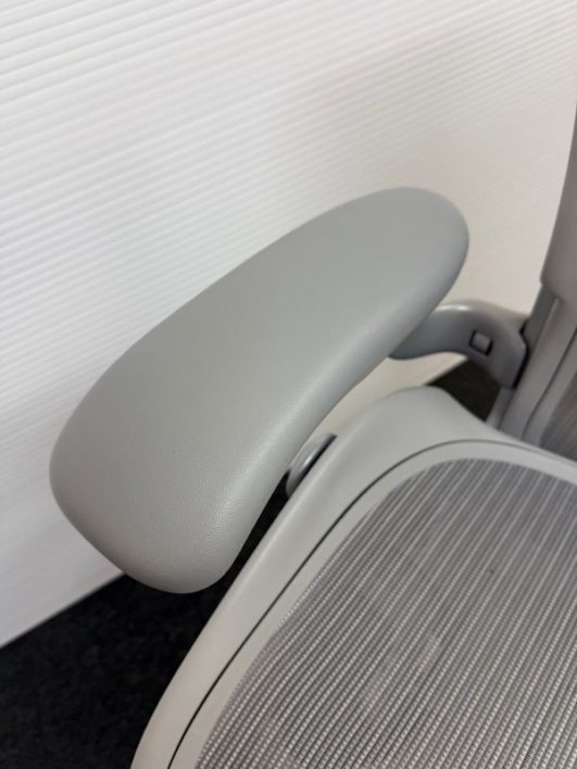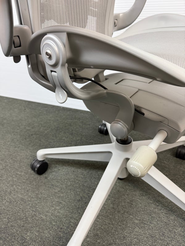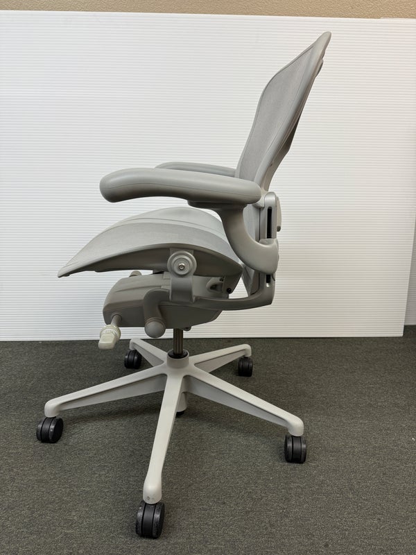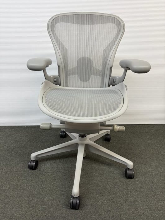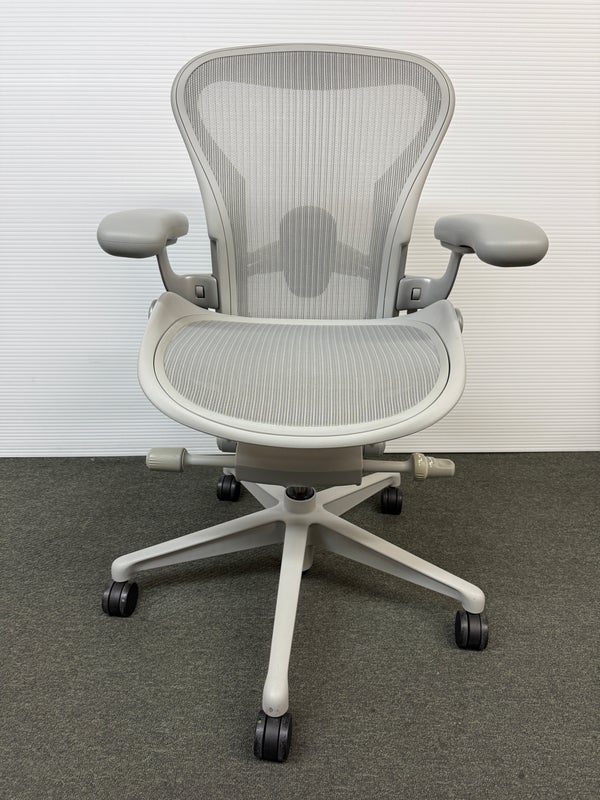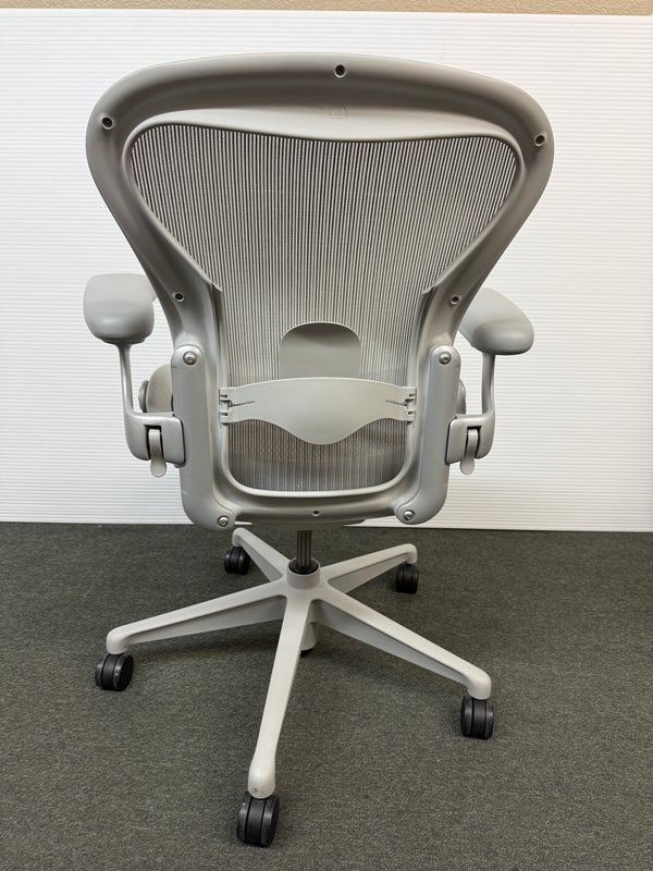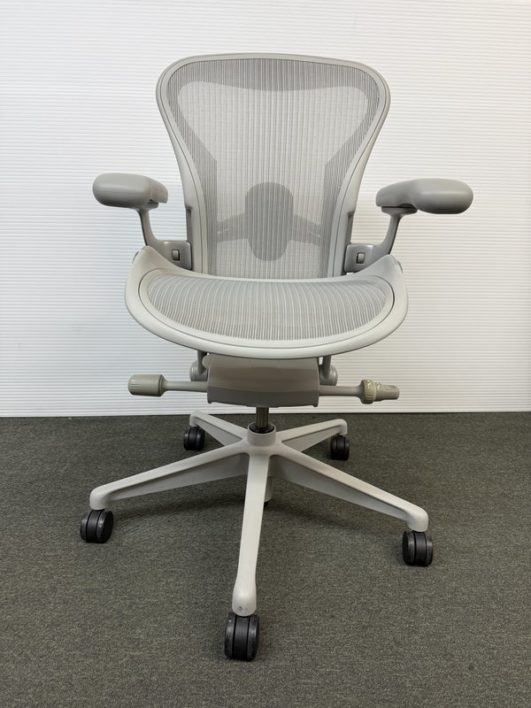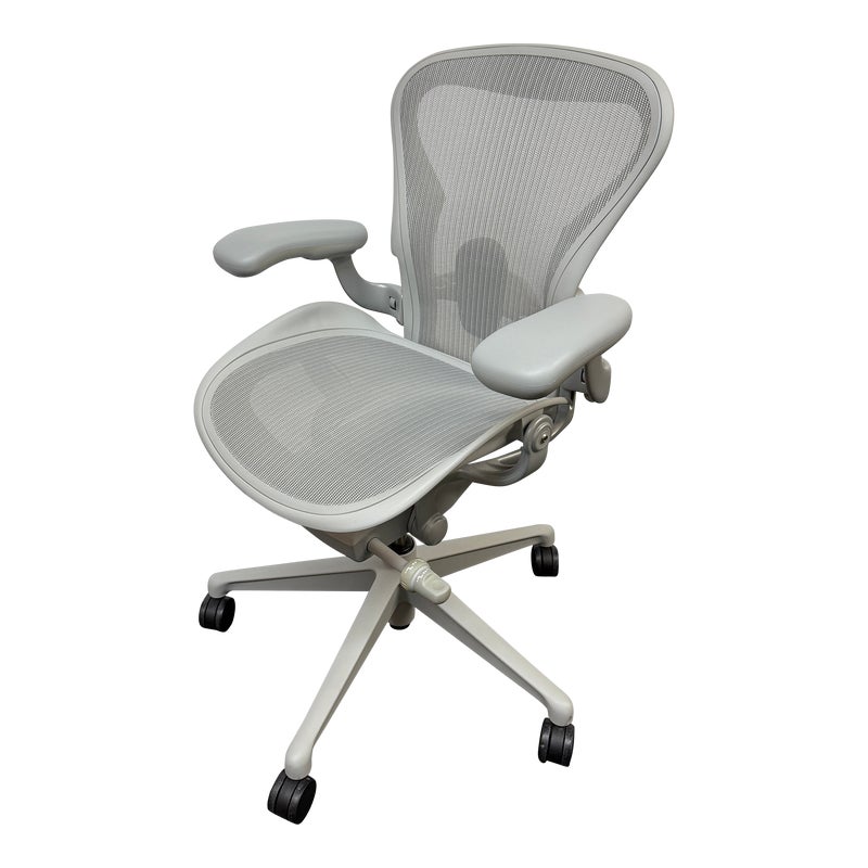 Design Plus Gallery presents an Aeron Office Chair by Herman Miller. Known for ergonomic comfort, the breathable seat and back offer an adjustable tilt, seat angle and superior back support. The arms are fully adjustable for further comfort. Mineral, Size A Features: Mineral Frame and gray mesh seat, lumbar pad support, fully adjustable arm rest; tilt Lock. Hhard casters, pneumatic lift. Light surface scratches, condition is consistent with age and use.