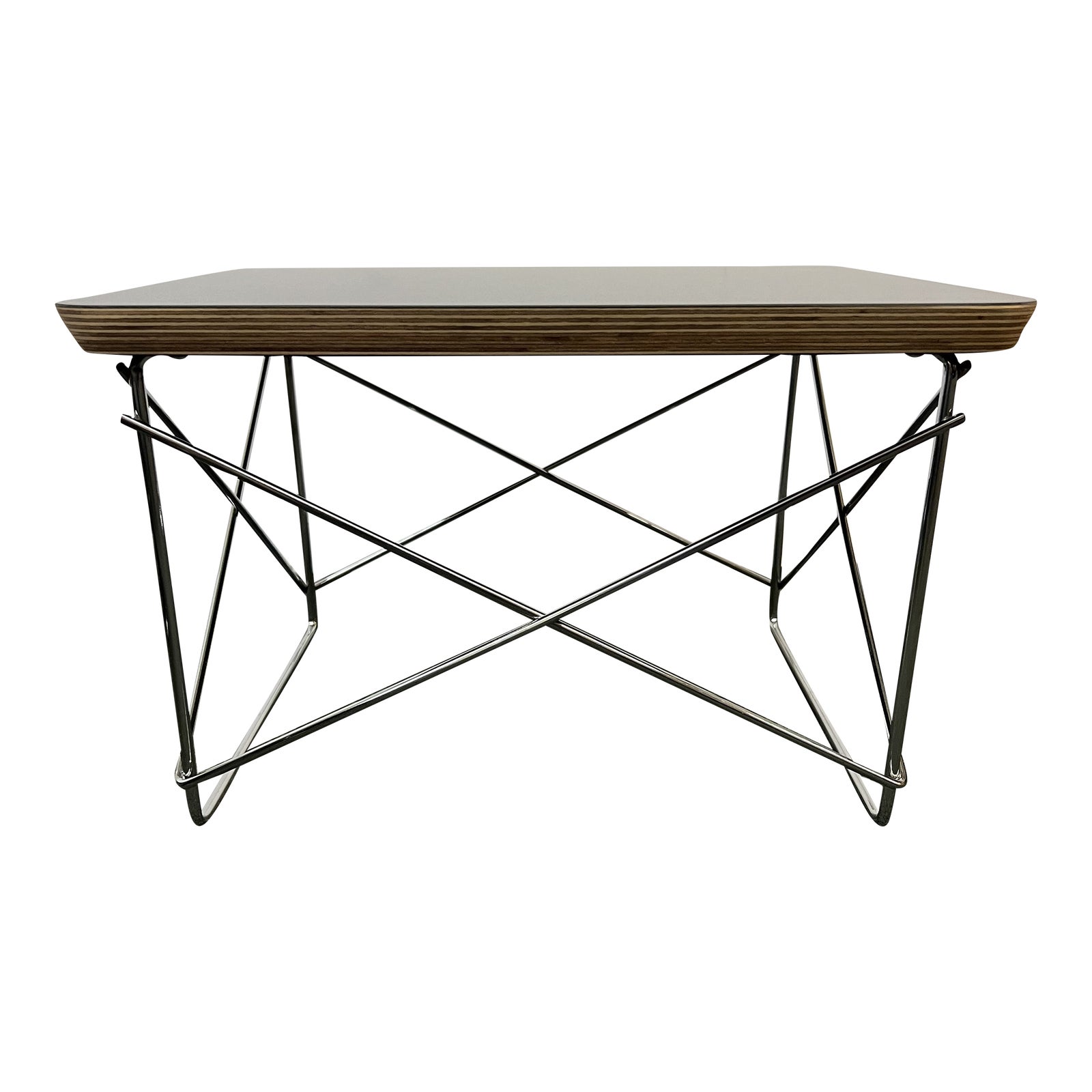 Design Plus Gallery presents a Eames Wire Base LTR Table by Herman Miller. Designed by Charles & Ray Eames in 1950. Just 10″ high, the table provides a handy surface for books or a bedside lamp. The top can be unscrewed and swapped out; its edges beveled at a 20-degree angle, offer a glimpse of the seven layers of birch plywood that comprise it. Portable and lightweight, the table can be stacked for storage or grouped to form a larger surface. This is the authentic Wire Base Low Table produced by Herman Miller. Eames is a licensed trademark of Herman Miller. The surface is black laminate, the frame is chrome.
