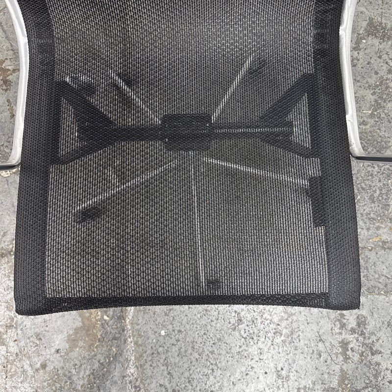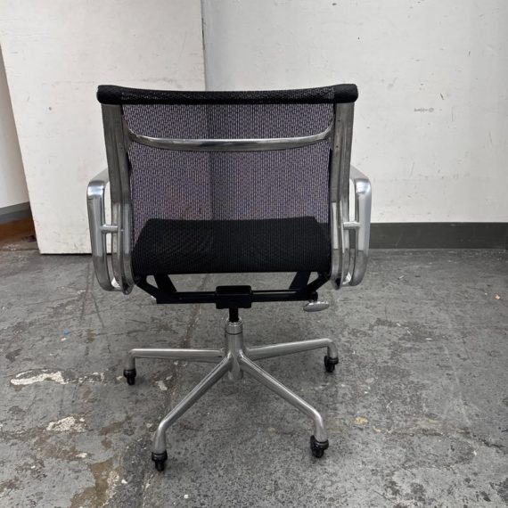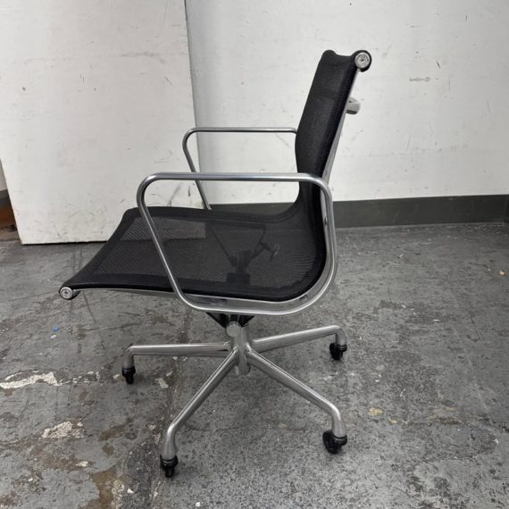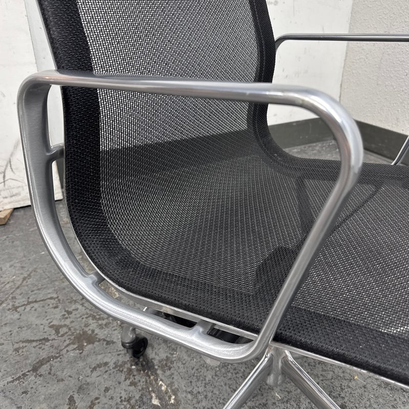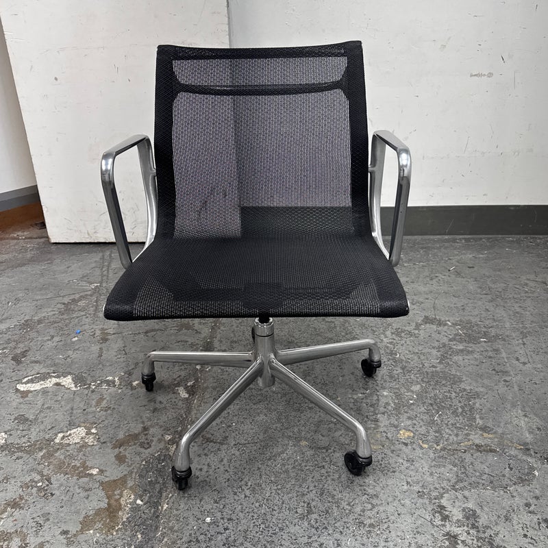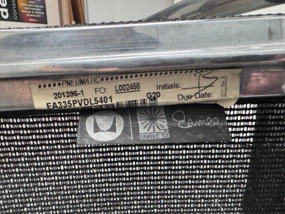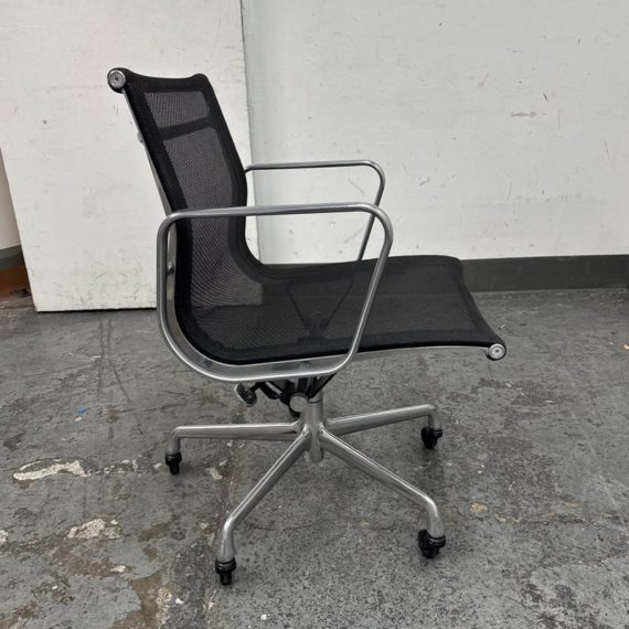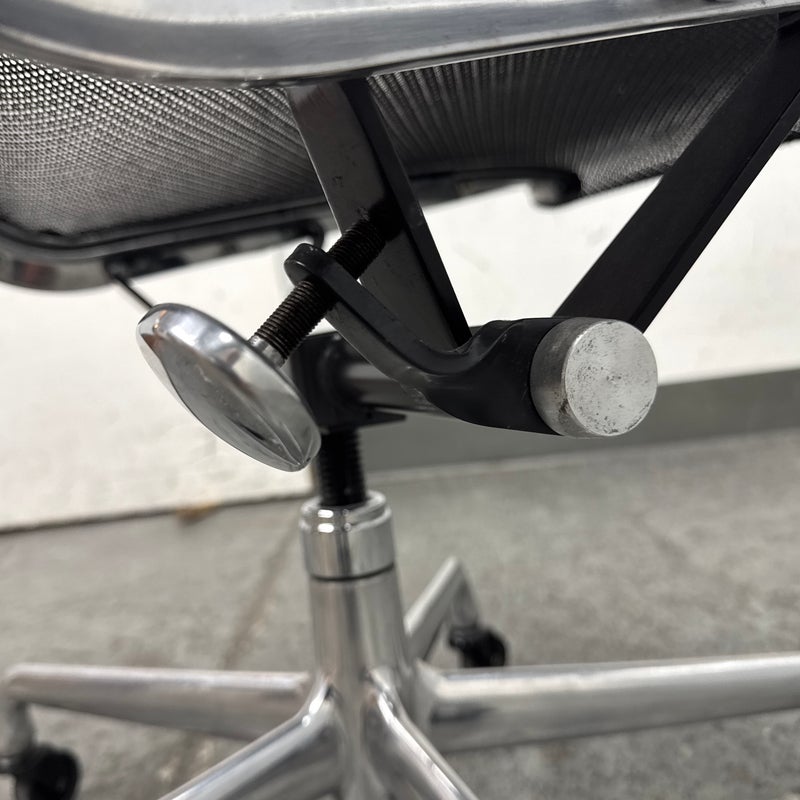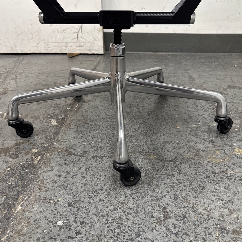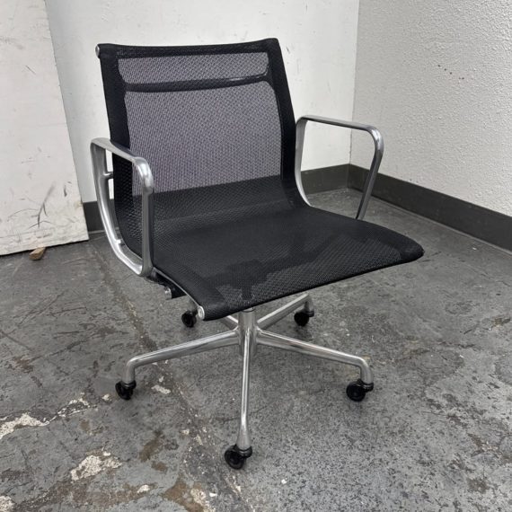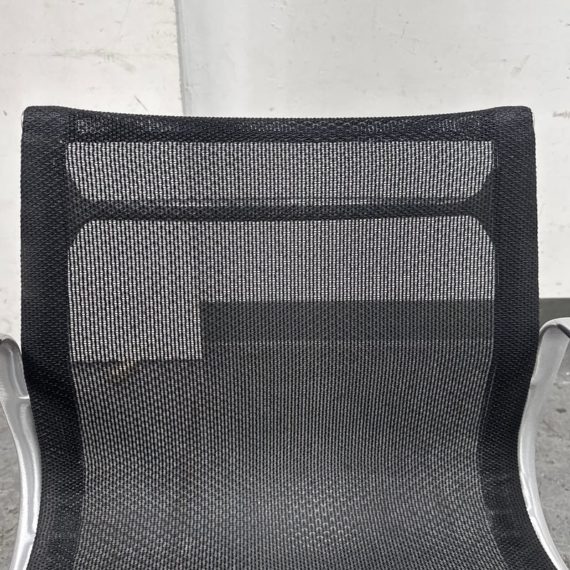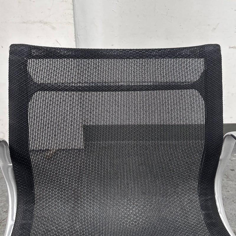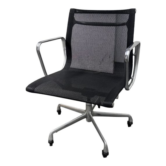 Design Plus Gallery presents a Eames Aluminum Group Chair by Herman Miller. Part of the Eames Aluminum Group Collection. These distinctive chairs resulted from the Eames’s experimentation with aluminum, which became more affordable after WWII. Today, the management chair has aluminum side ribs that hold the one-piece, seat-back suspension taught to create a flexible “sitting pocket” that gently cradles you as you sit. In good condition, visible and minimal wear from usage + age. Made in USA.