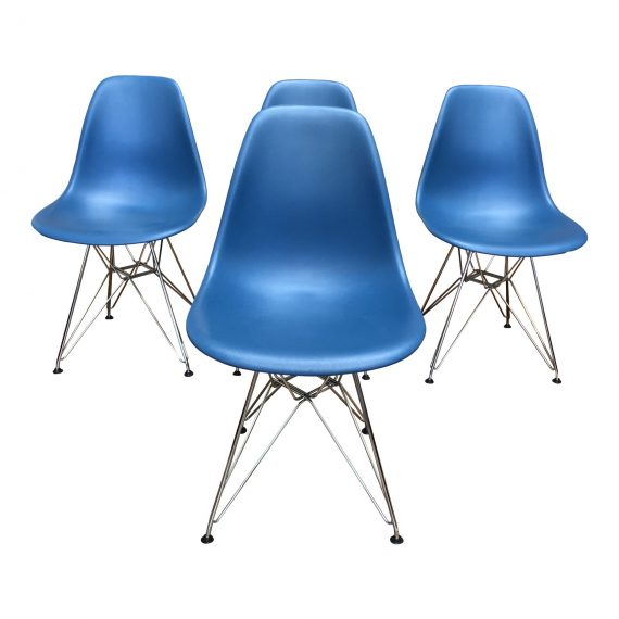 Design Plus Gallery presents a set of Four Eames Molded Plastic + Wire Side Chairs by Herman Miller. Purchased from Design Within Reach. Designed by duo Charles and Ray Eames in 1948. Ray & Charles believed that “design is a method of action,” and they continually updated their work as new materials became available. Their Molded Plastic chairs were originally designed in metal and entered as a prototype in MoMA’s 1948 International Competition for Low-Cost Furniture Design. The deep seat pocket and waterfall seat edge keep you comfortable by reducing pressure on the backs of thighs. This is an authentic chair by Herman Miller, Inc. Eames is a licensed trademark of Herman Miller. The shell color is a Peacock Blue with a Chrome Finish Wire Base. Made in U.S.A. Seat Height: 18 inches.