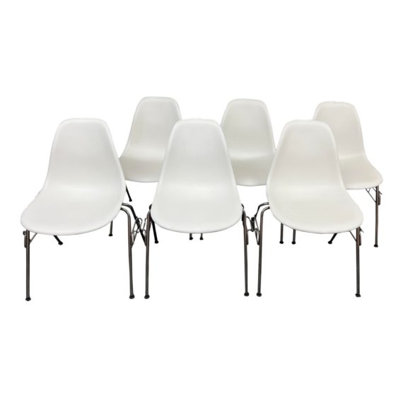 Design Plus Gallery presents a set of Six Fiberglass Side Chairs with Stacking Base. Designed by duo Charles and Ray Eames in 1948, it is immediately recognizable and so functional. This Eames Molded Fiberglass Chair (1950) is the end result of research for greener production methods. This reintroduced fiberglass version has a deep seat pocket with a waterfall edge that will reduce pressure on the backs of your thighs. This is an authentic Eames product by Herman Miller. The shell color is a White with a Chrome plated metal legs. Light evidence of wear; overall good condition. Made in U.S.A.