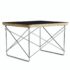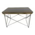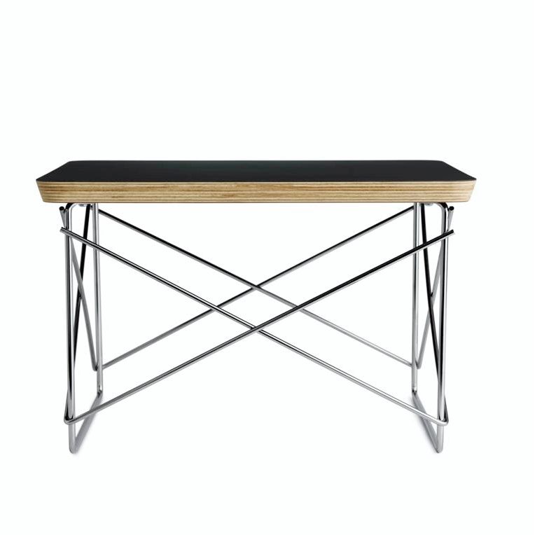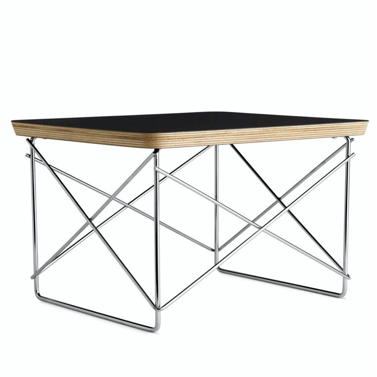 Design Plus Gallery presents a Wire Base Low Table by Herman Miller. Designed by Charles and Ray Eames in 1950. Its scaled-down profile shows the influence of Japanese forms and households based on an aesthetic ideal of simplicity. The height provides a handy surface for a stack of books or a place to rest a drink. Produced by Herman Miller. The top is black with a chrome finish base. Made in U.S.A.