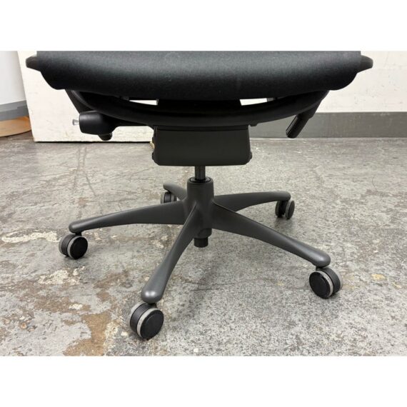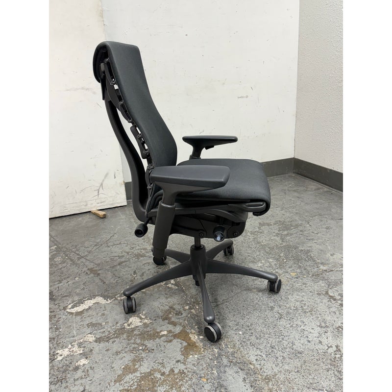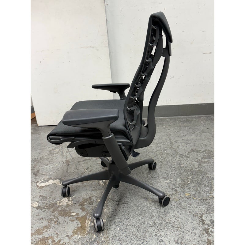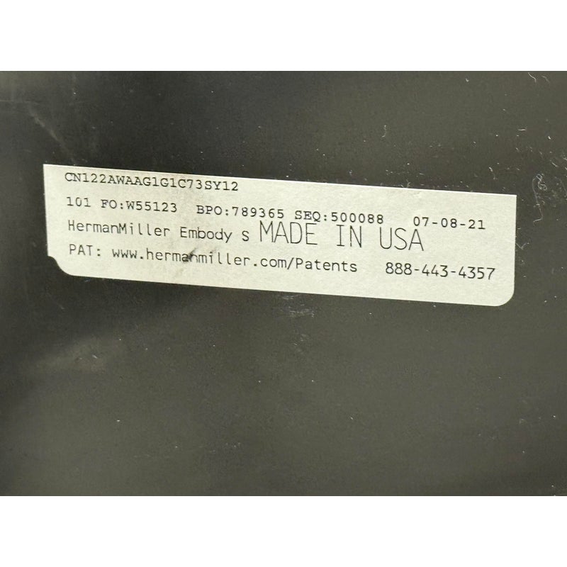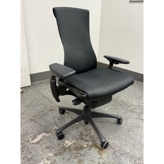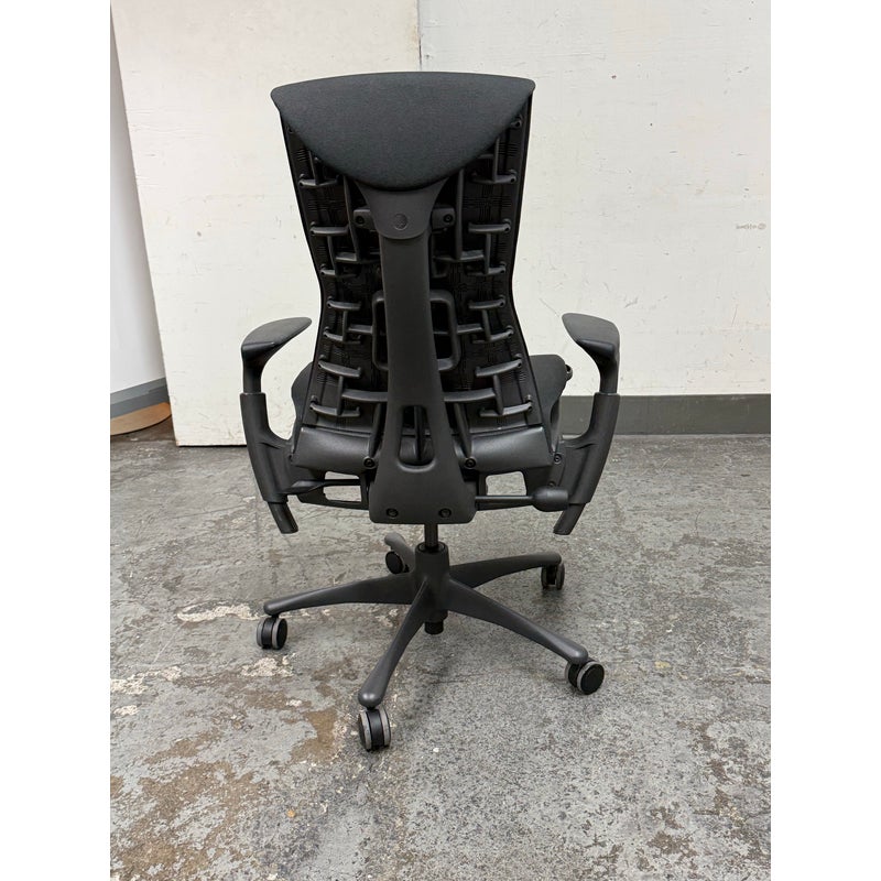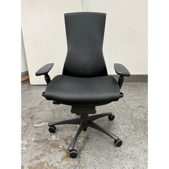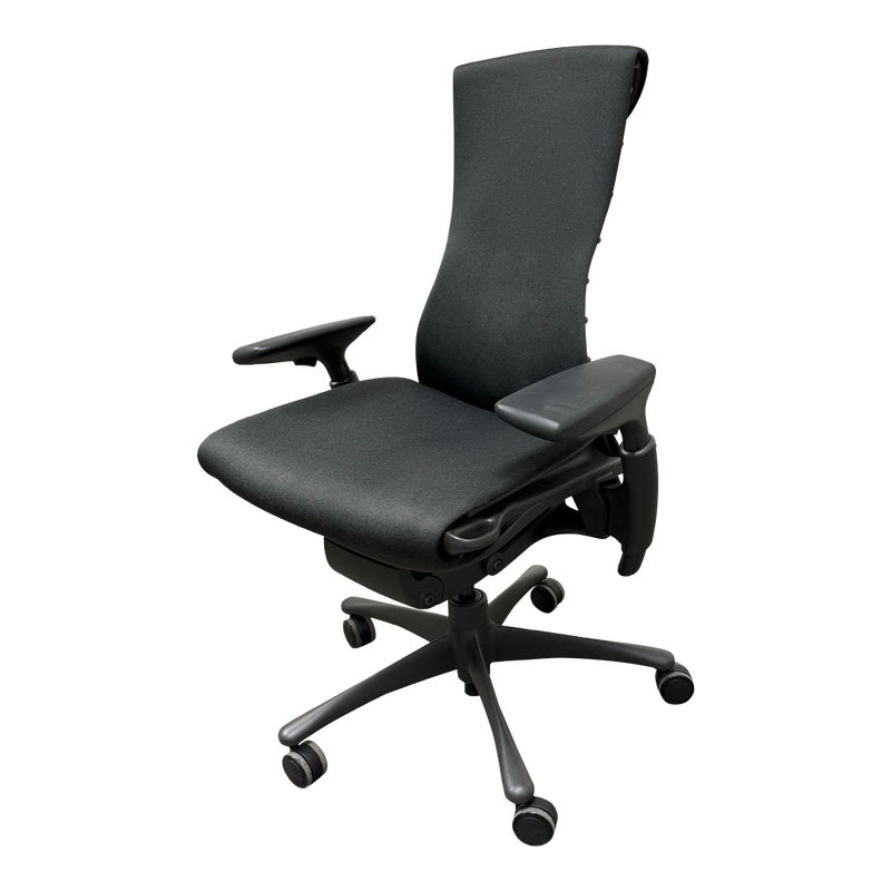 Design Plus Gallery presents an Embody Office Chair by Herman Miller. Physicians and PhDs in the fields of biomechanics, vision, physical therapy, and ergonomics used their expertise to guide the development of this chair. The back adjustment allows alignment with your spine’s natural curve, allowing a neutral, balanced posture. All the technology and design is on full display. The Embody Chair is now recognized for pressure distribution, natural alignment, and support for healthy movement in ergonomic seating. Upholstered in black fabric with a sculptural high back, the chair has a contoured seat, adjustable arms, and a streamlined rolling base. Its distinctive profile highlights the advanced ergonomic engineering Herman Miller is known for, with an adaptable form that responds to the body’s movement throughout the day. It is in good condition with visible and minimal wear from usage. Made in the USA.