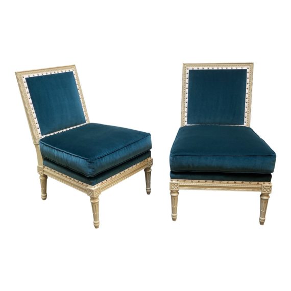 Design Plus Gallery presents a pair of Aynsley Slipper Chairs by Hickory Chair Company. Inspired by an antique French chair, this design by Suzanne Kasler offers the casual versatility of a slipper chair with elegant hand-carved detailing and tapered legs in Birch finish. Scaled and crafted for comfort, the seat cushion is luxurious spring down. The teal velvet is detailed with silver nail head trim over white grosgrain ribbon. Luxury Spring-Down seat cushion standard.