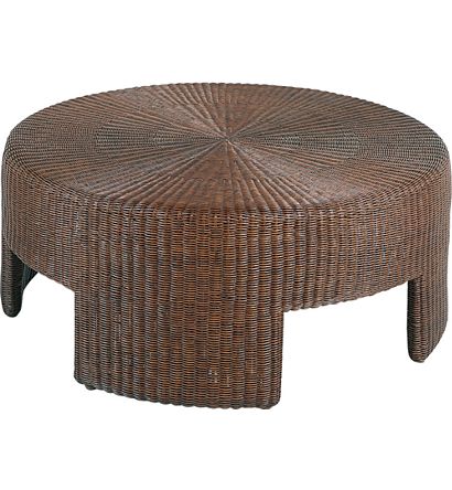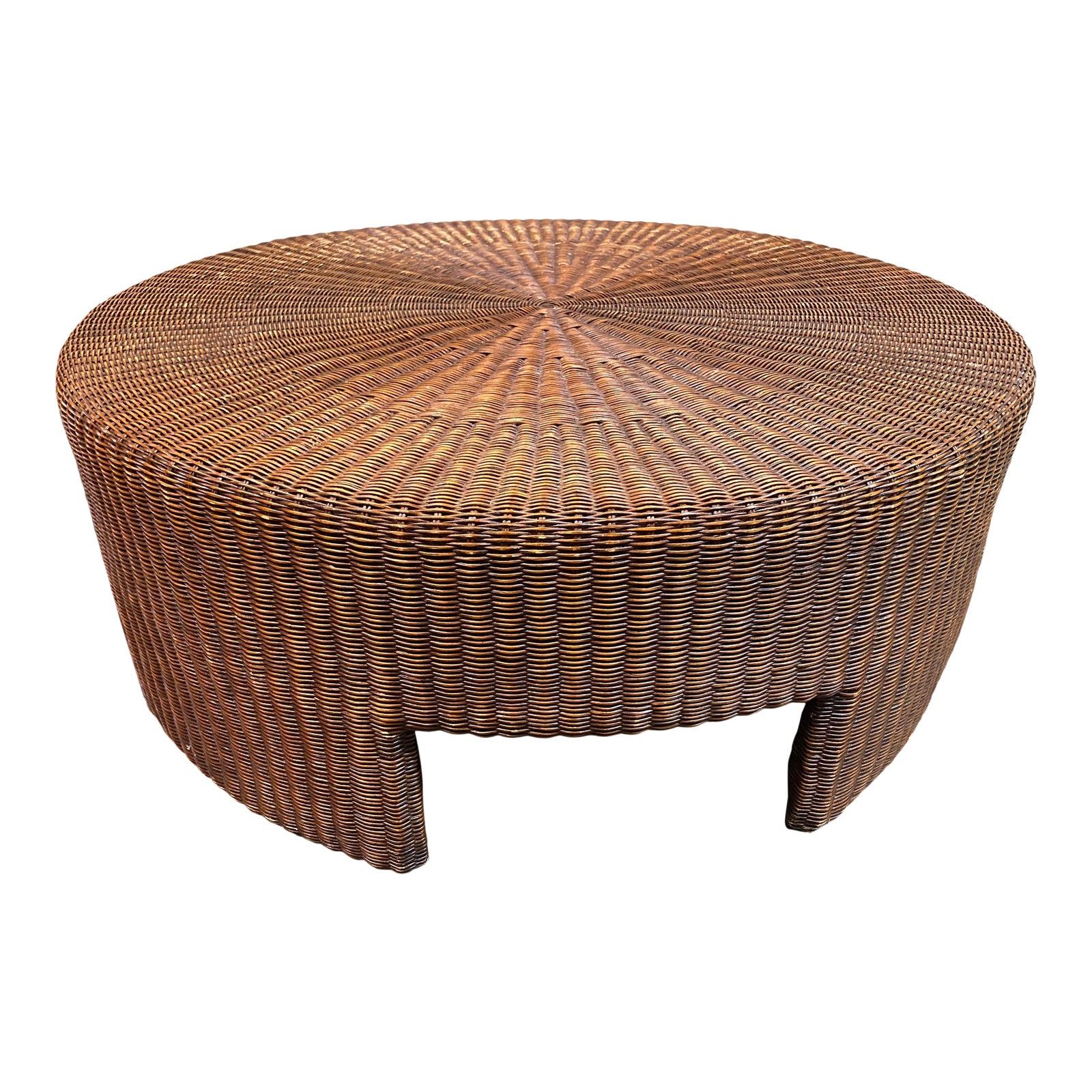 Design Plus Gallery presents a Wicker Coffee Table by Hickory Chair Company. This chunky round cocktail table features a unique wicker surface that is supported by a sturdy frame. Finished in a warm umber finish, it is an organic table for your seating arrangement.