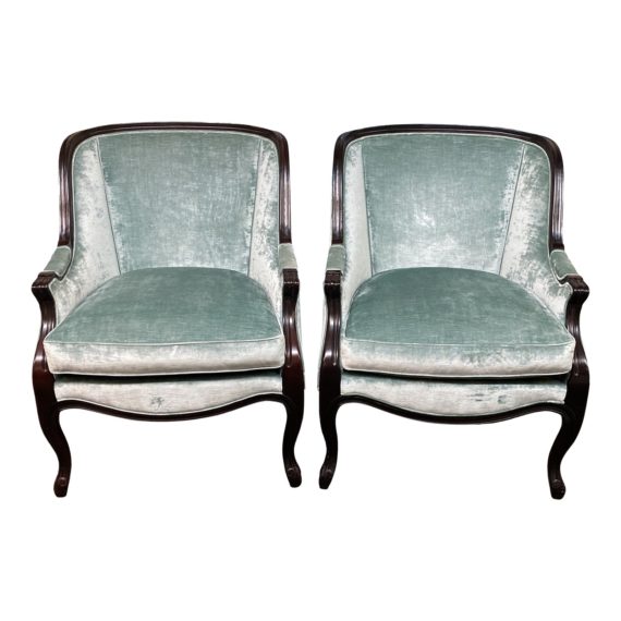 Design Plus Gallery presents a pair of Bergere Chairs by Hickory Chair. Lovely, fabric protected velvet in a soft teal contrasts elegantly against the dark wood frame finish. Down and feather wrapped seat cushion invites relaxation in this lovely pair of chairs. Small stain under the cushion. Minor wear. Made in Hickory, North Carolina.