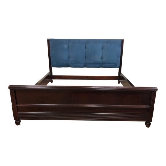 Design Plus Gallery presents an custom anne eastern king size bed frame by Hickory Chair Furniture. An elegant bed crafted from soldi woods in a dark walnut finish. The headboard is tufted and upholstered in a rich blu fabric. Minor wear on fabric and frame. Made in USA.