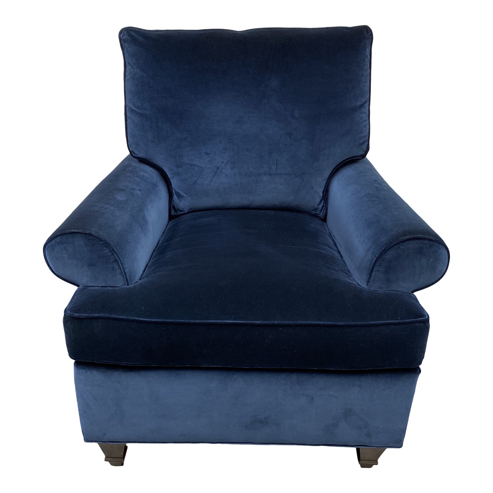Design Plus Gallery presents a Hickory Chair Blue Velvet Arm Chair. Hickory chair has been manufacturing bench quality solid wood upholstered pieces for over 100 years in North Carolina. Seat and back cushions are filled with a down wrapped high density cushion. Tapered coffee stained wood feet anchor the elegant silhouette. Minor wear on the fabric.