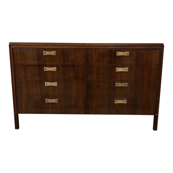 Design Plus Gallery presents an elegant dresser from Hickory Furniture. This functional double-width dresser is perfectly scaled with eight roomy drawers. Removed of embellishment it brings interest with a simple rail trim. The top drawer is divided and features a coin catch. Brass fittings.