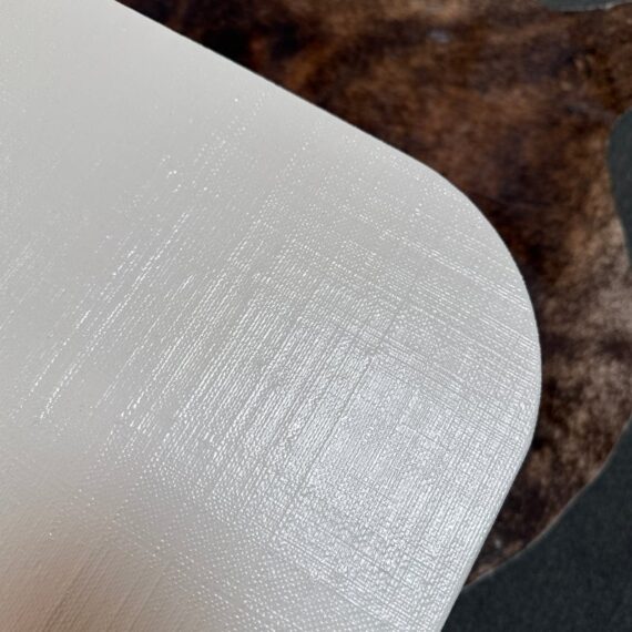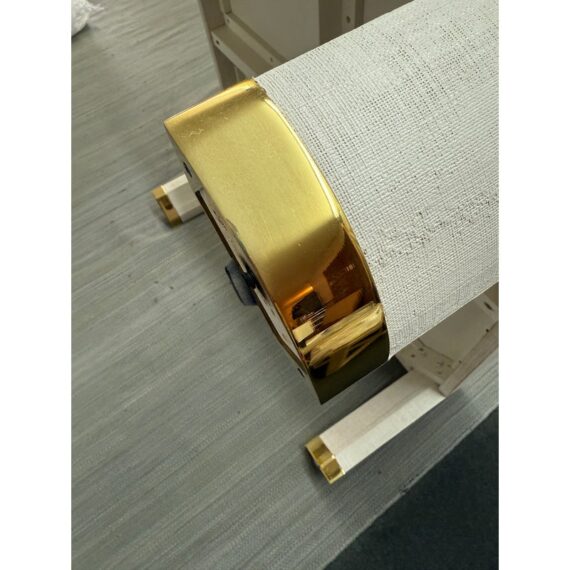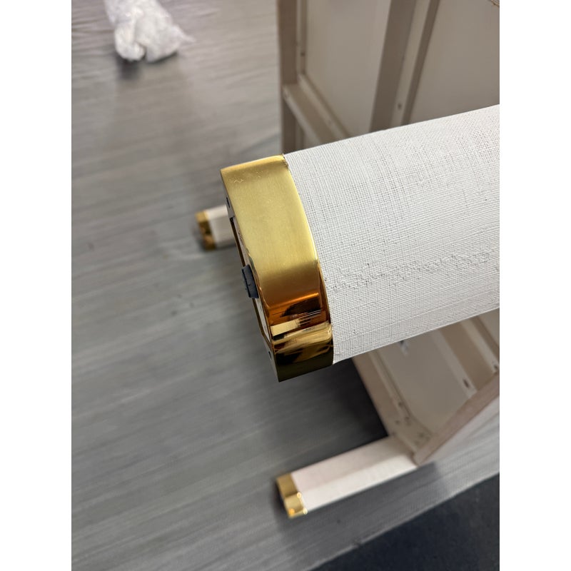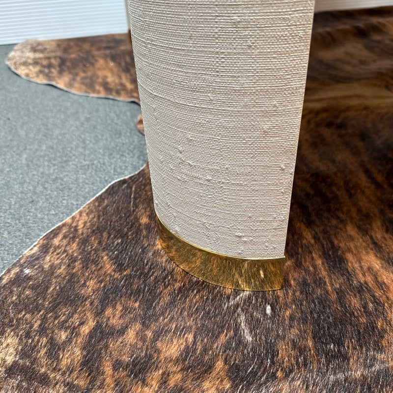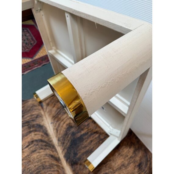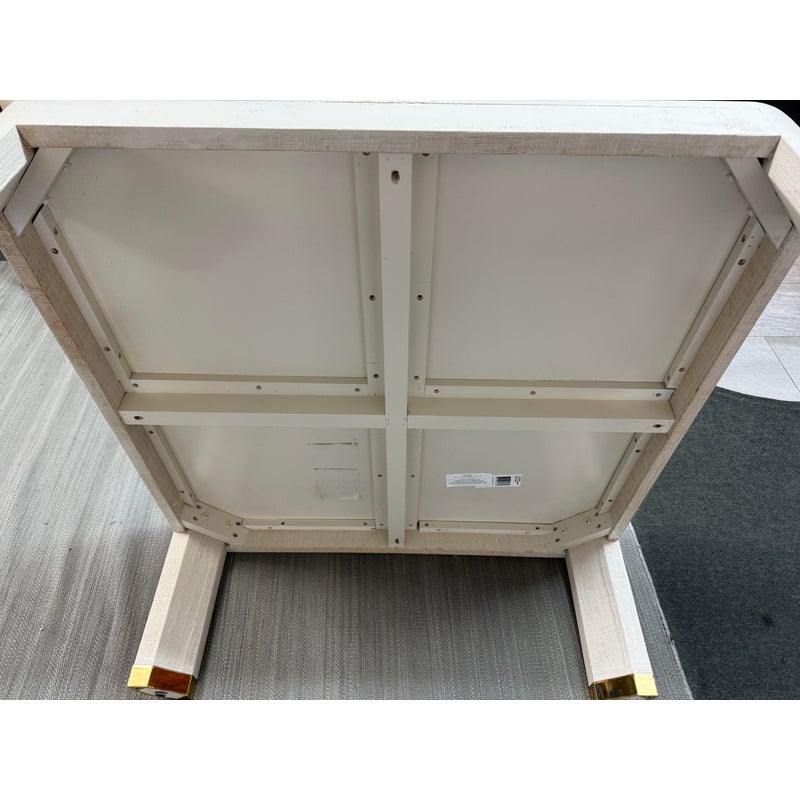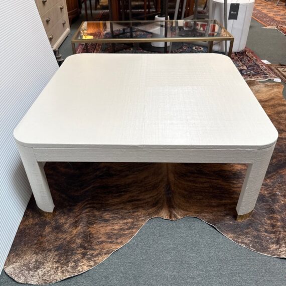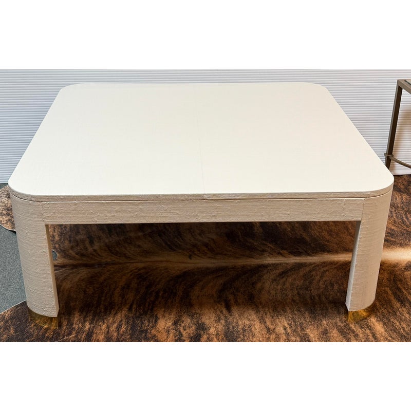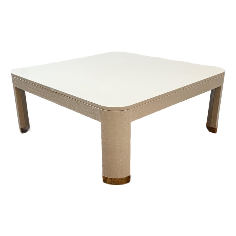 Design Plus Gallery presents the Willie Coffee Table from Highland House. The coffee table has rounded edges that soften its appearance. The table is made from solid oak wood that is then wrapped in an ivory tone of raffia veneer. All four legs have brass cap ends. The table will be an elegant centerpiece for your living space. This table is in good showroom condition with minimal wear.