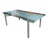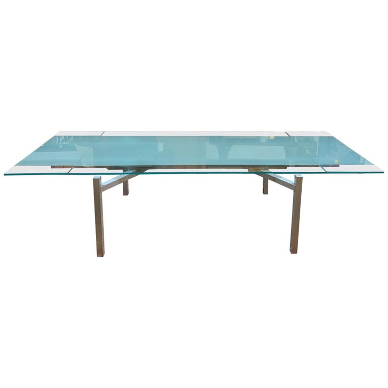 Design Plus Gallery presents a Contemporary Glass Extension Table by Kikko San Francisco. A gray powder coated base supports an expanse of frosted glass. Two extension leaves slide out from each end and settle into place with an additional 39 inches of dining space. Each can be used independently as needed.