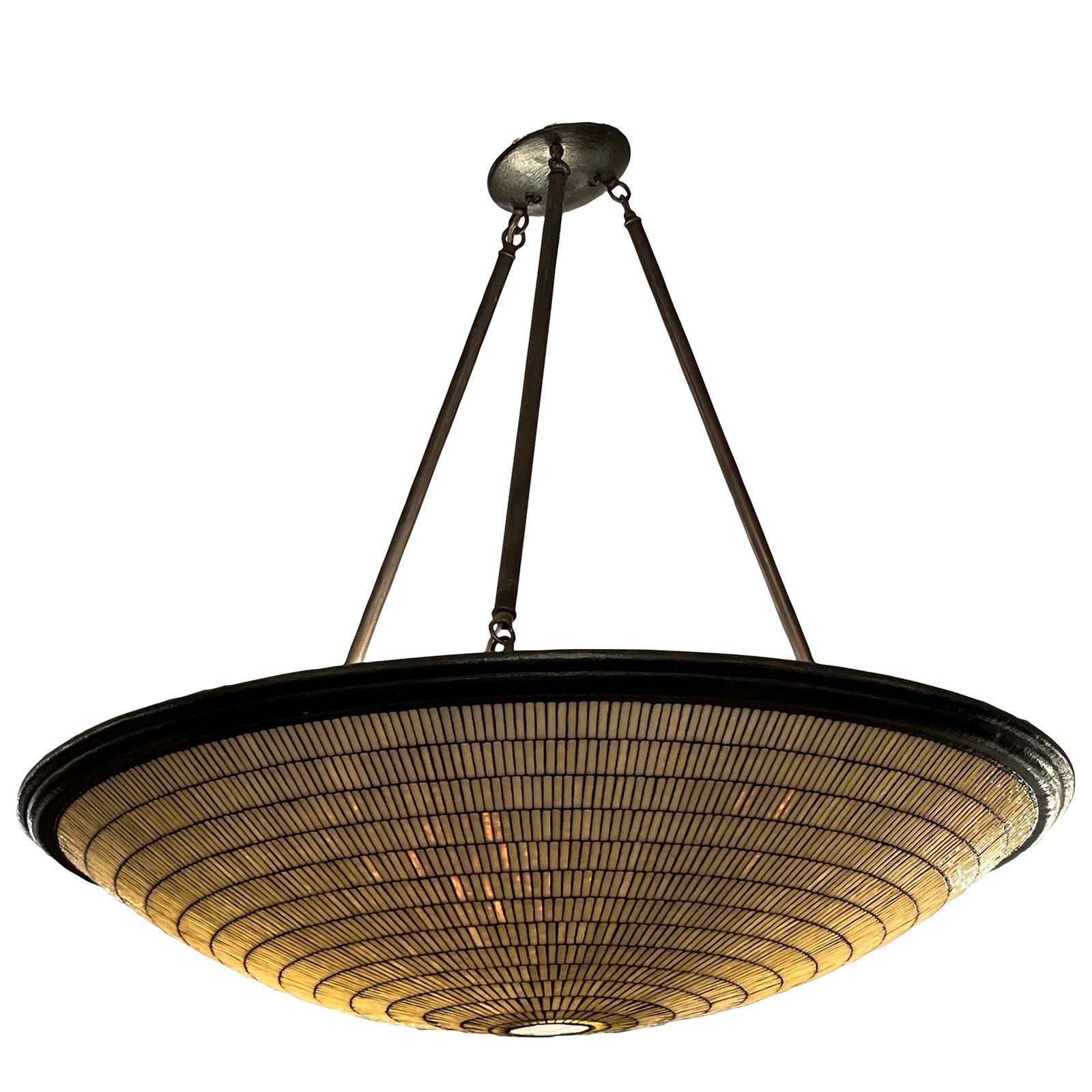 Design Plus Gallery presents a Venetian Dome Chandelier by Hilliard Lighting. Handcrafted from hundreds of mosaic hand cut glass tiles soldered together then married to a cast bronze frame. Fotged from an antique bronze patina with kiln-fired ivory glass tiles. In good condition with minimal signs of surface wear and condition.