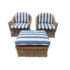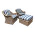 Design Plus Gallery presents a Wicker Indoor/Outdoor Set of Chairs + Ottoman by Hing’s Co. The sturdy set will bring many years of enjoyment with the braided detail and weaving in this design. The cushions are easily removable for cleaning and give off a coastal vibe, in a blue and white stripe. The set is in good condition, with visible wear, fading and markings on upholstery, that is consistent with age + usage.