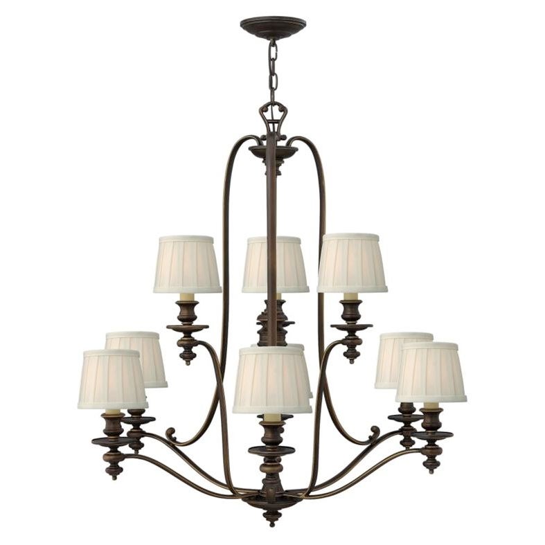 Design Plus Gallery presents a Nine Light Dunhill Chandelier by Hinkley Lighting. Dunhill’s transitional style features painted antique candle sleeves and sturdy round detailing in a Royal Bronze finish. The off-white pleated fabric shades and vintage-inspired faux alabaster glass add classic details for an authentic look.
