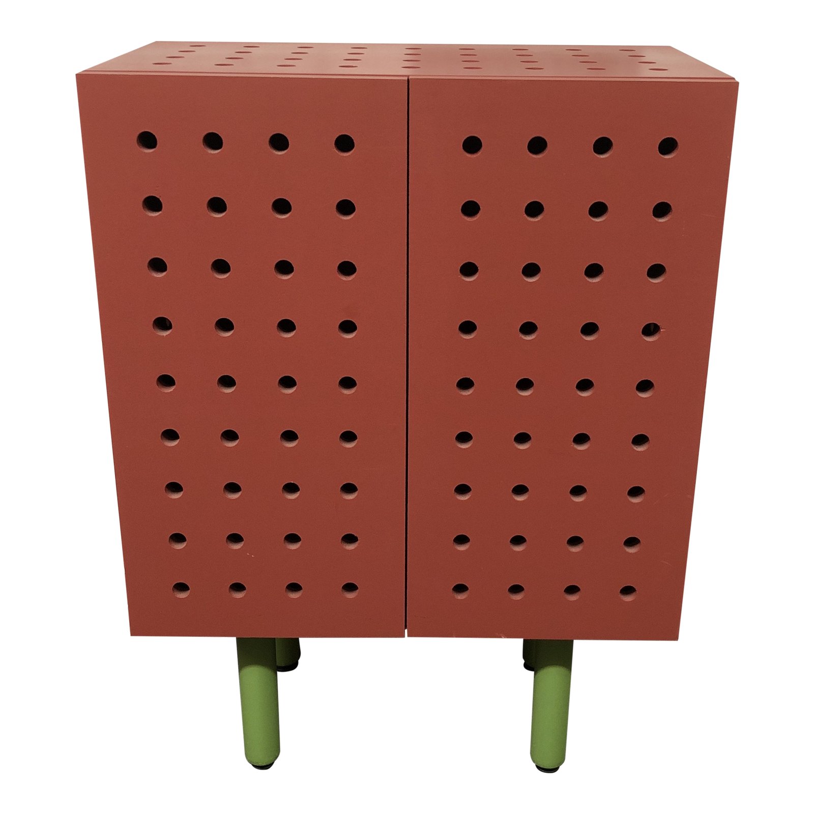Design Plus Gallery presents a custom designed modern cabinet. Fully ventilated, the whimsical storage stands jauntily on bright green metal legs. Shelves are fixed.