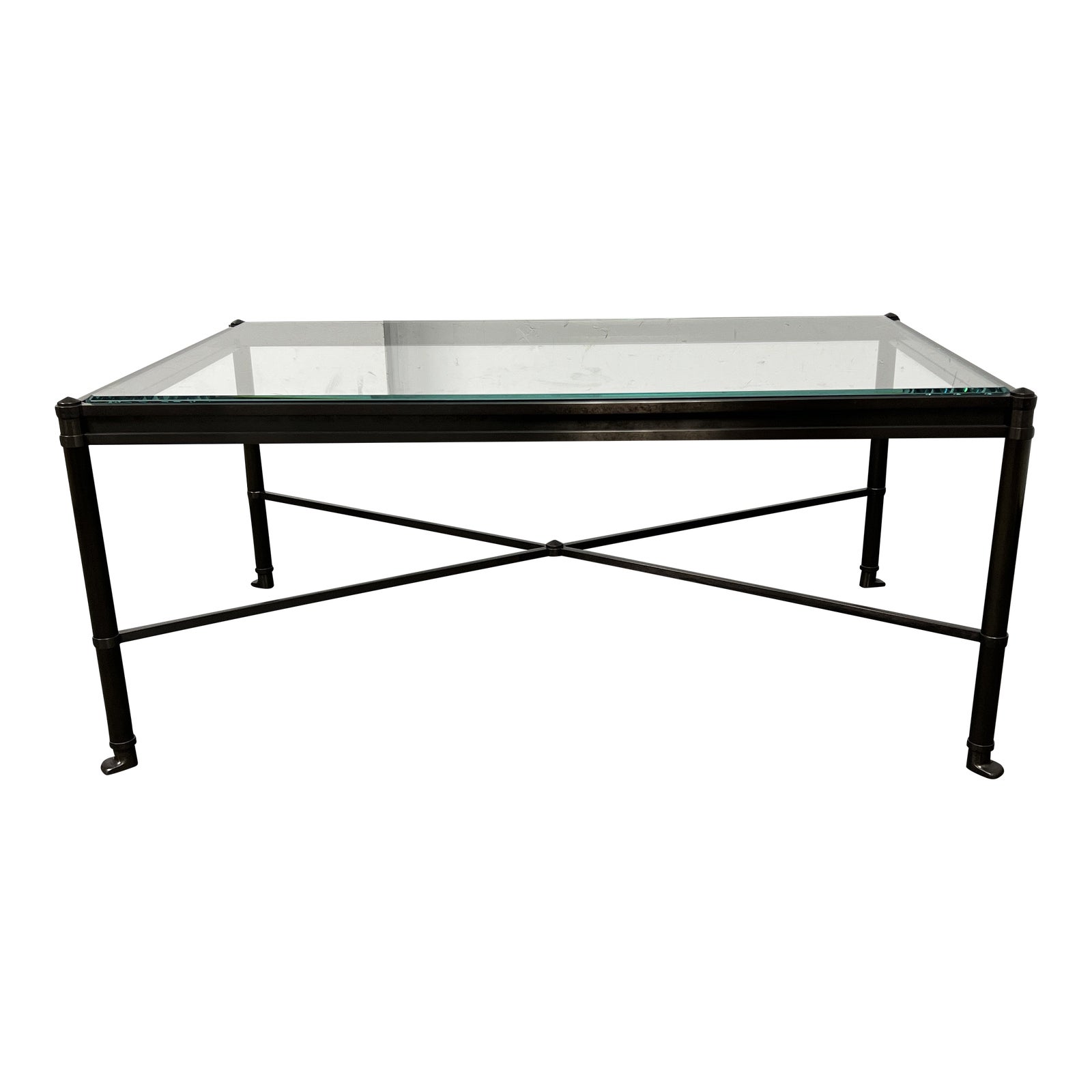Design Plus Gallery presents a D’Orsay Cocktail Table by Holly Hunt. A contemporary Antique Bronze finish base is elegant and simple with a clear glass top. Minor wear.