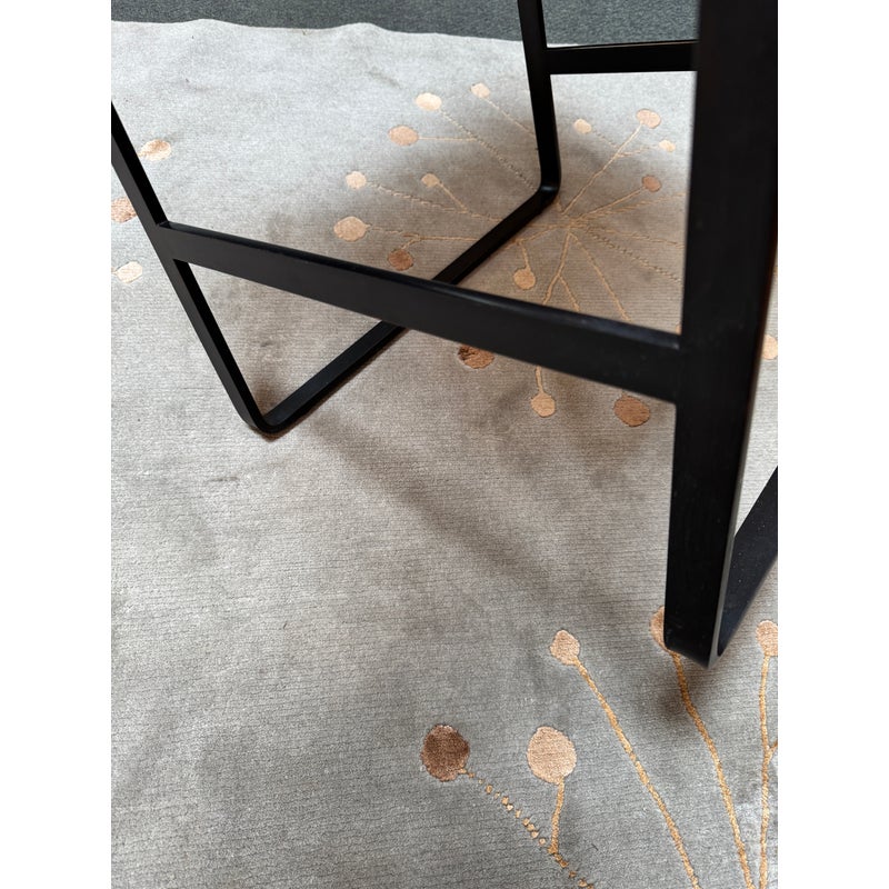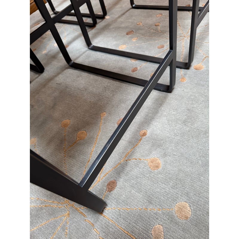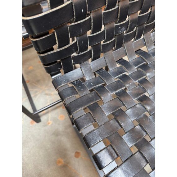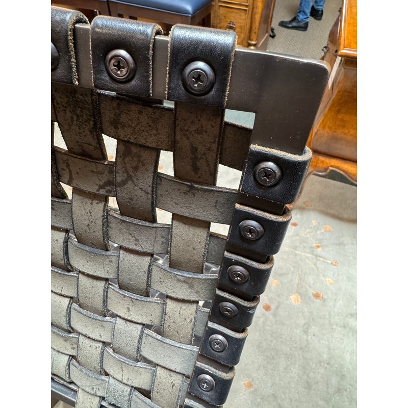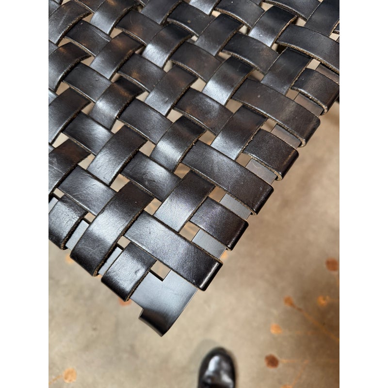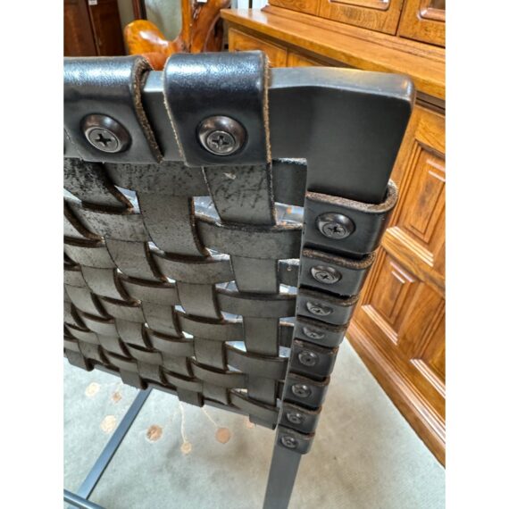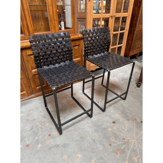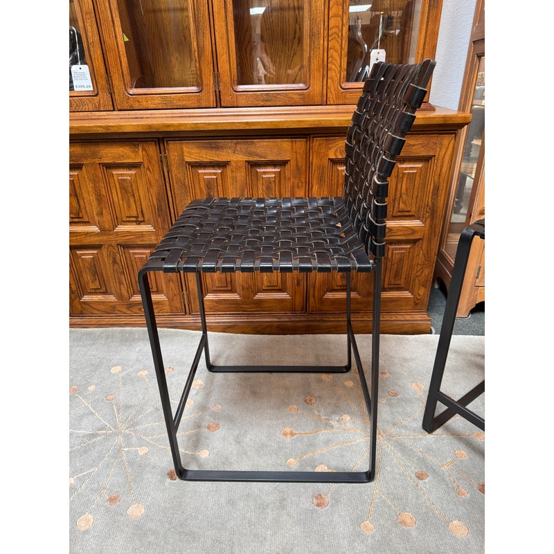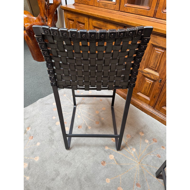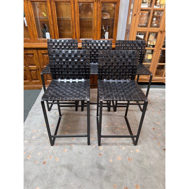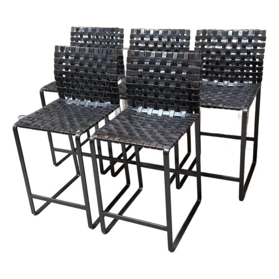 Design Plus Gallery presents a Set of 5 March Albrecht Studio Counter Stools for Holly Hunt. The thoughtful high-back designs demonstrate a timeless minimalism of darkened stainless steel enhanced with organic warmth of English bridal leather. Crafted with care from high-quality materials made to withstand the rigor of home life. Light surface wear; condition is good for age and use. Made in the USA