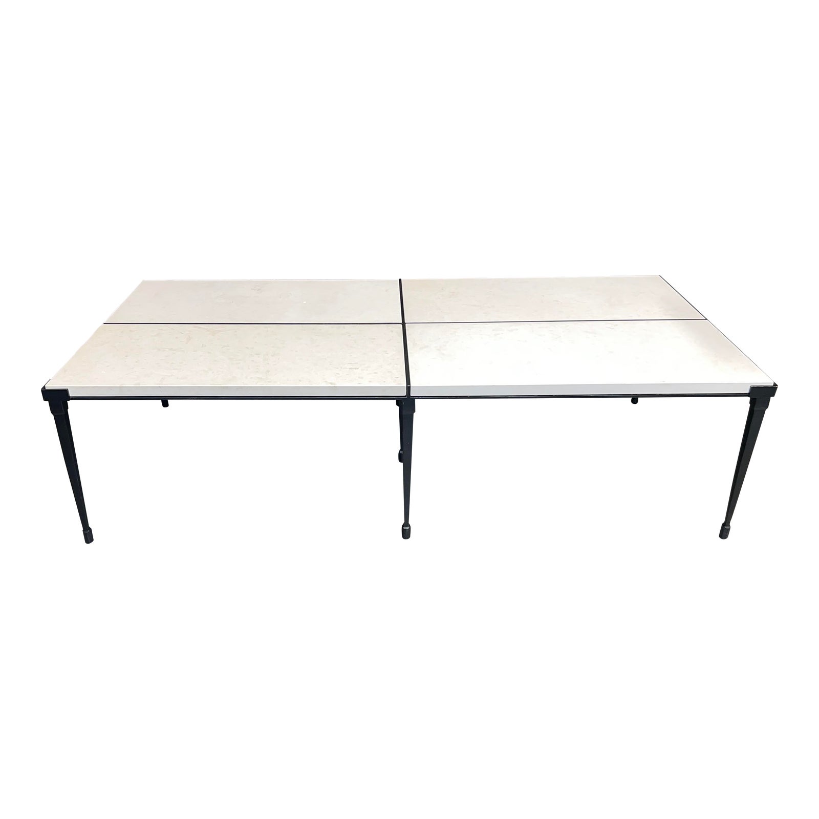 Design Plus Gallery presents a Rue De Seine Cocktail Table by Holly Hunt. The base is constructed with hand forged iron. The rectangular top consists of four stone segments. The table incorporates clean, bold lines and is inspired by mid-century French neoclassicism. Minor chip on top corner + surface. Visible + minor wear from use; table is in good condition.