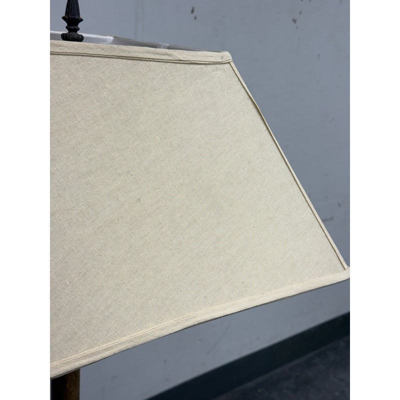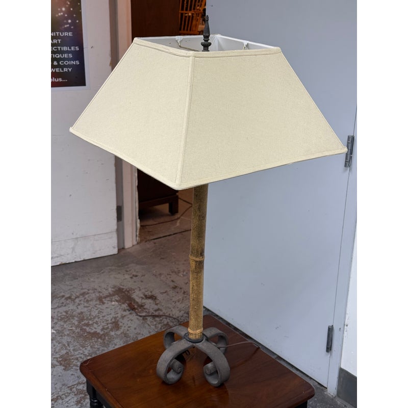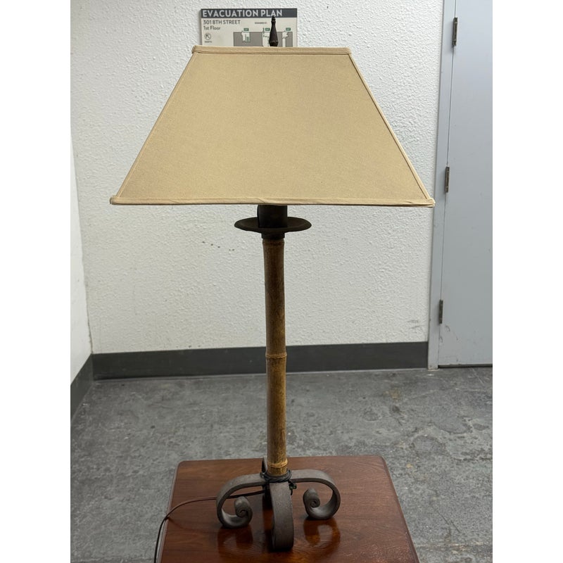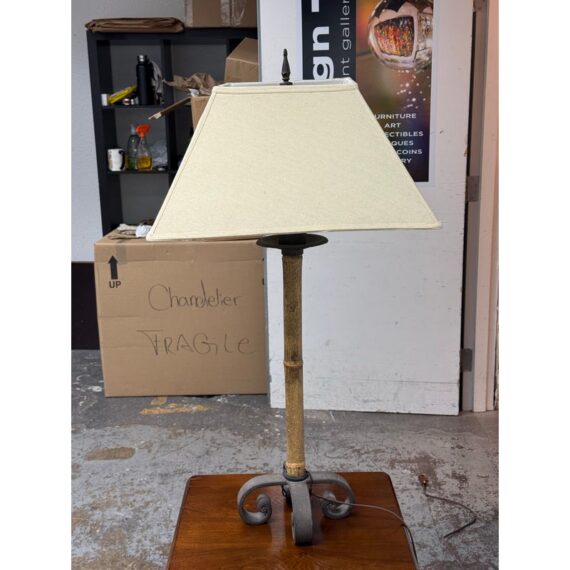 Design Plus Gallery presents a Vintage Hollywood Regency Bamboo Form Table Lamp + Rectangular Shade. It has a tapered linen shade, bamboo form, and scroll iron base. The lamp combines organic texture with sculptural detailing in a balanced silhouette, while the patina and surface variation throughout the frame highlight its age and character. The neutral shade softly filters light, and the variation across the metal and bamboo form elements adds depth and individuality. The lamp shade does wobble. It is in good condition with visible and minimal wear from usage. .