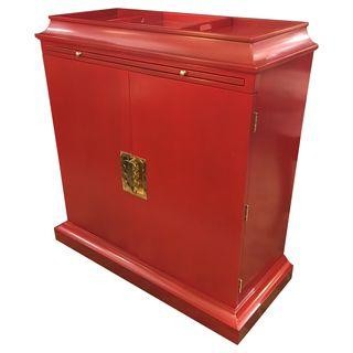 A brand new Palisades Bar. The Barclay Butera Palisades Bar is a study in Contemporary American design. The compact and efficient frame is coated in a luxurious lacquer finish, complete with jewel-like brass hardware. Functionality has not been ignored. Designed as a bar cabinet, the Palisades Bar has two internal shelves for tall and short bottles and glasses. A matching removable mirrored tray fits snugly into the top, and a pull out shelf adds additional space for mixing your favorite cocktail. The color is red. (Straight out of the box.)