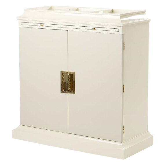 This brand new Barclay Butera Palisades bar is a study in contemporary American design. The compact and efficient frame is coated in a luxurious lacquer finish, complete with jewel-like brass hardware. Functionality has not been ignored. Designed as a bar cabinet, the Palisades Bar has two internal shelves for tall and short bottles and glasses. A matching removable mirrored tray fits snugly into the top, and a pull out shelf adds additional space for mixing your favorite cocktail. The color is ivory. Straight from a SF Showroom.