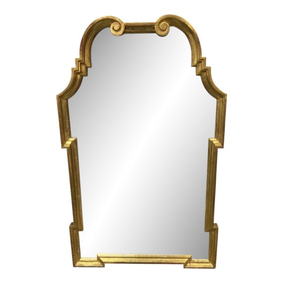 Design Plus Gallery presents a Hollywood Regency Gold Empire Style Mirror. Wood frame has elegant French inspired curvature and moldings gilt with gold. There is visible wear through out, mirror is in good condition.