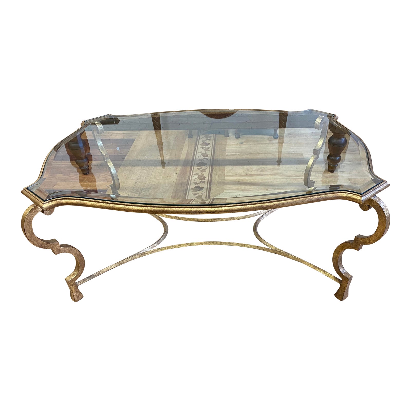 Design Plus Gallery presents a Gregorius Pineo Custom Glass + Gold Leaf #5185 Coffee Table. Antiqued French inspired curvature is made contemporary with the exaggerated lines and scale of the base. Beveled glass top sits securely within iron framing. Little evidence of wear. Overall rectangular form of table fills standard sofa spacing without the usual linear lines. And keeps a room feeling light + airy. A great table for showcasing a beautiful rug and coordinating metallic finishes throughout the home.