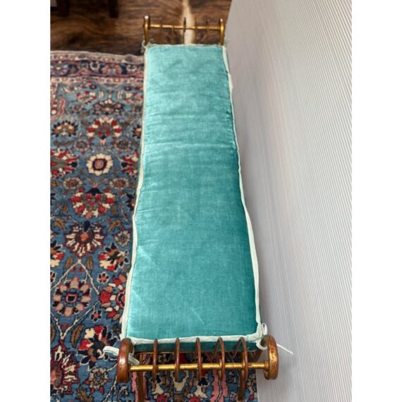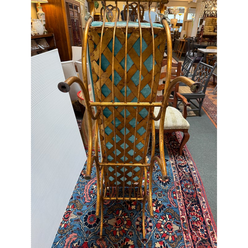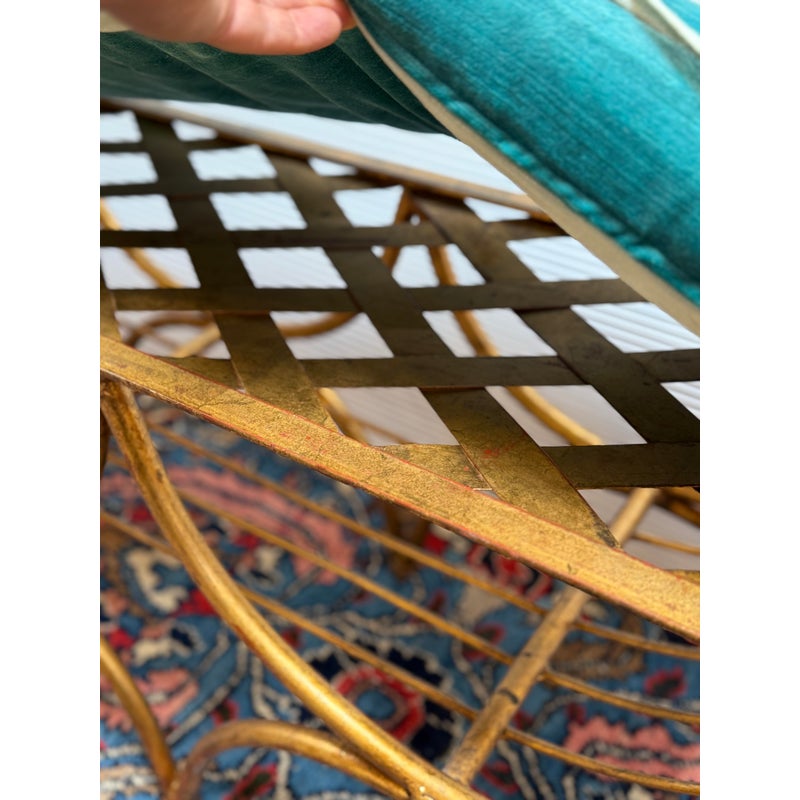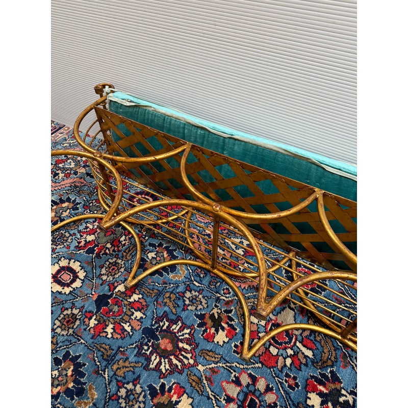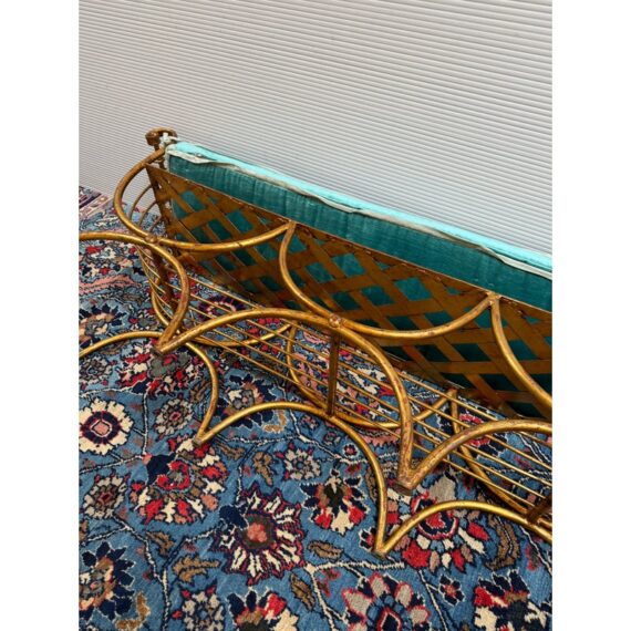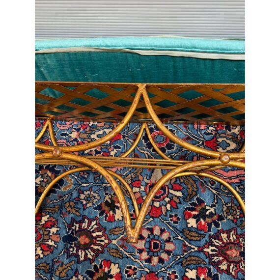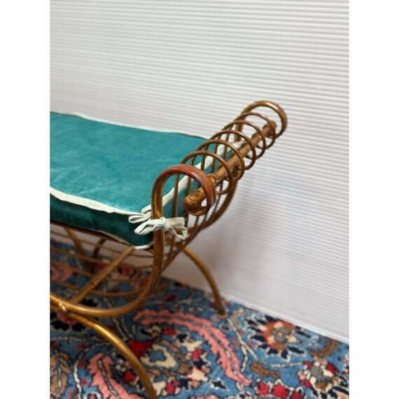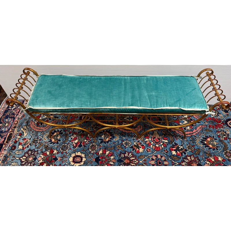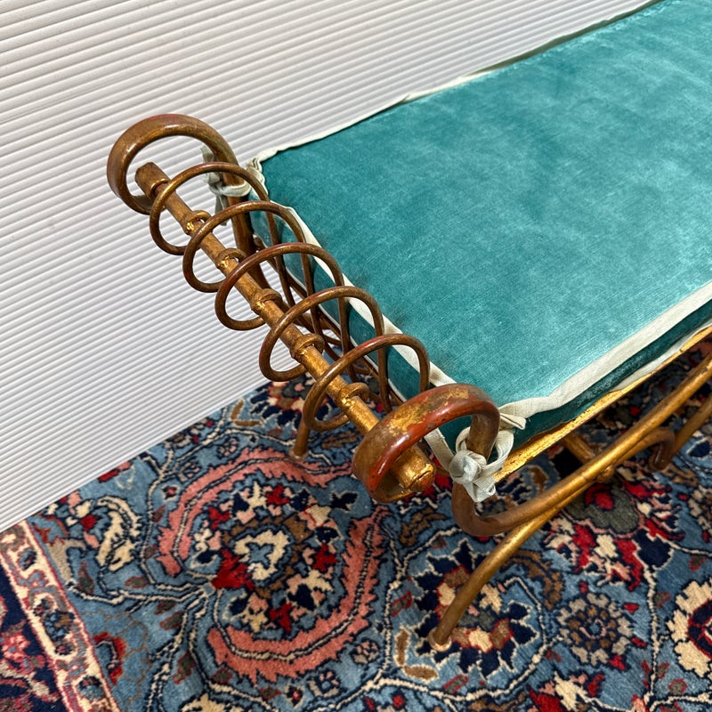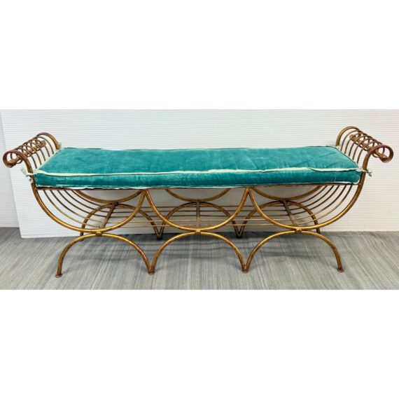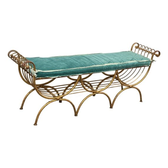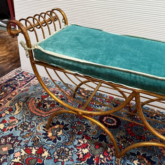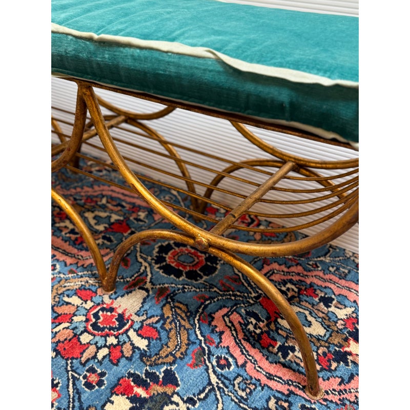 Design Plus Gallery presents an Italian Curule Bench from the Mid 20th Century. The bench is in the ever so glam Hollywood Regency style and is made from iron forms with a gold gild finish. The three seater bench is perfect at the end of your King Size bed or window seat in a glam household. Made in the late 1950s and from Italy. Comes with a turquoise velvet bench seat cushion, perfectly formed for a splendid sit. Visible wear is consistent with its vintage age + use.