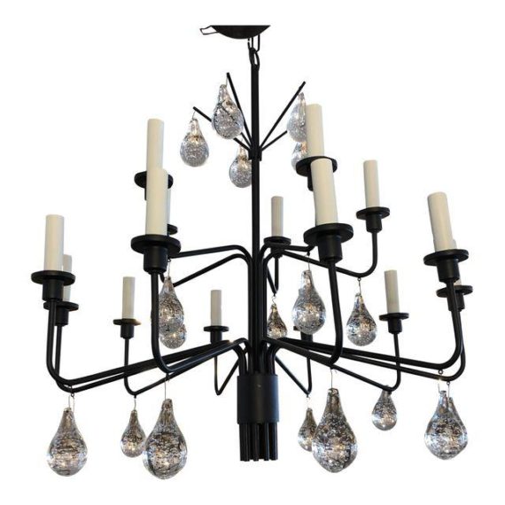 Design Plus Gallery presents a unique chandelier. Made in Denmark, designed by Holm Sorenson, the dark iron frame is contrasted with ethereal bubble glass drops. Make it yours with an interesting bulb choice.