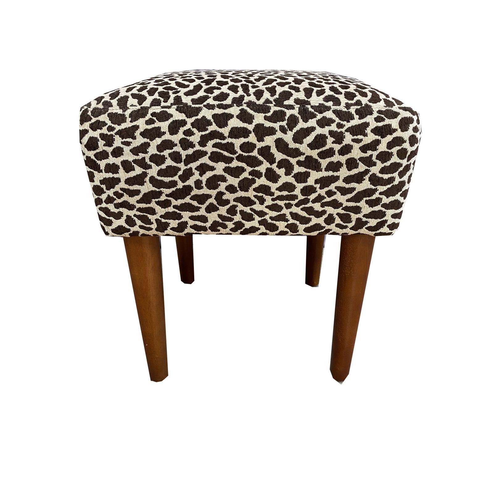Design Plus Gallery presents a Home Goods Square + Animal Print Stool. Add a fun accent of pattern with this upholstered stool or ottoman. Tapered chestnut stained legs give the look a mid-century inspired transitional appeal. Minor wear on surfaces.