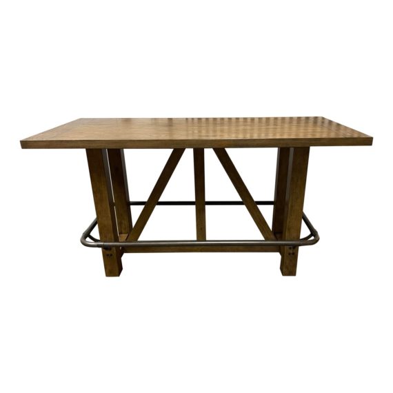 Design Plus Gallery presents a Light Oak Bar Table by Home Meridian. Grab a favorite beverage and gather around this simple, handsome plank bar table. The light oak top uses oak veneers for natural beauty that brings out stunning grain details. The base incorporates a stylized A-frame trestle and a wraparound pipe footrail for casual-industrial vibes. A fantastic decor piece that makes every hour a happy hour, add this well-designed table to your home for entertaining in style. Made in Vietnam.