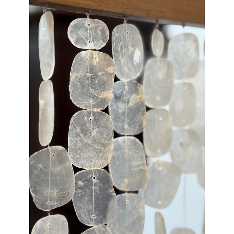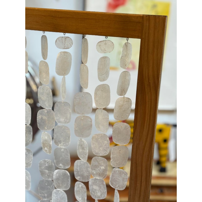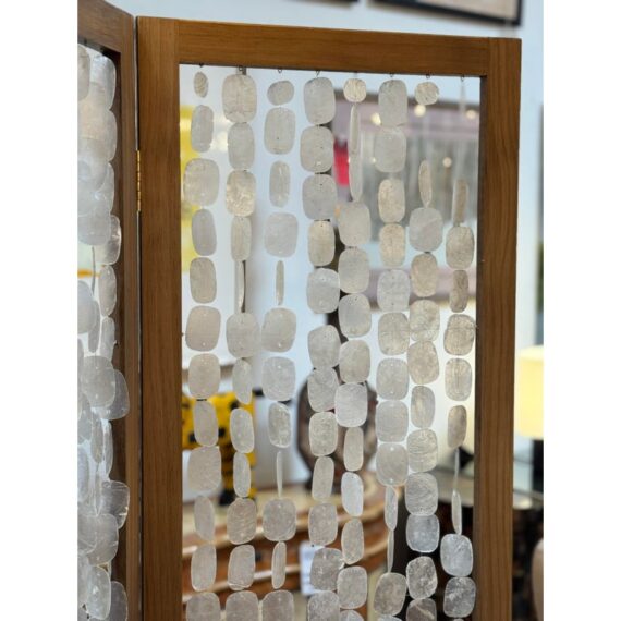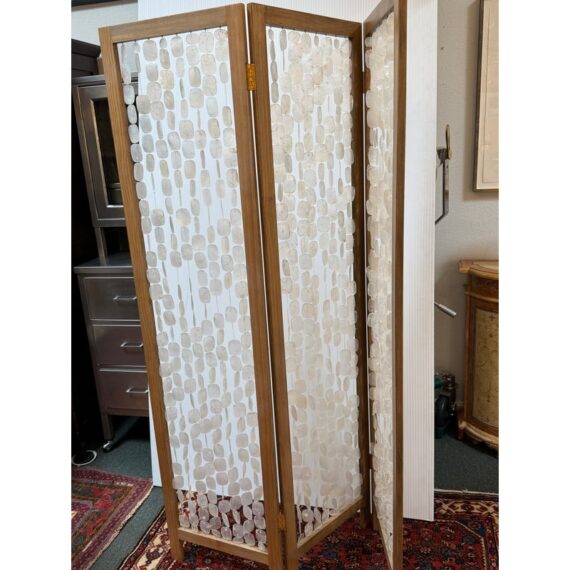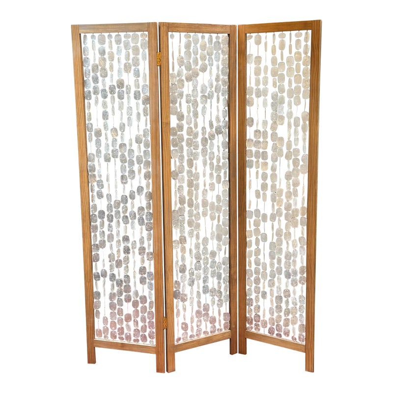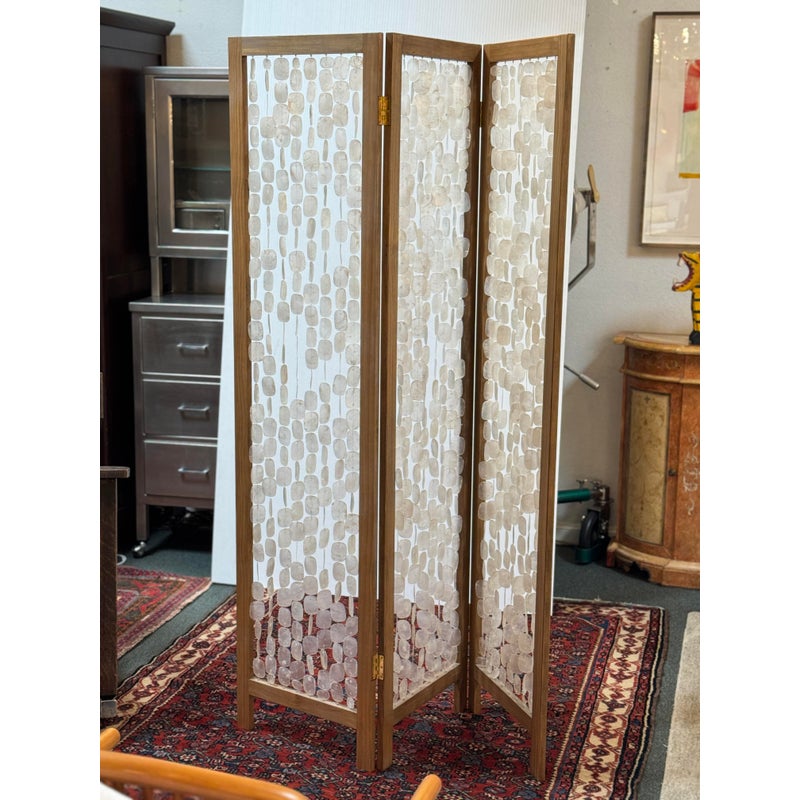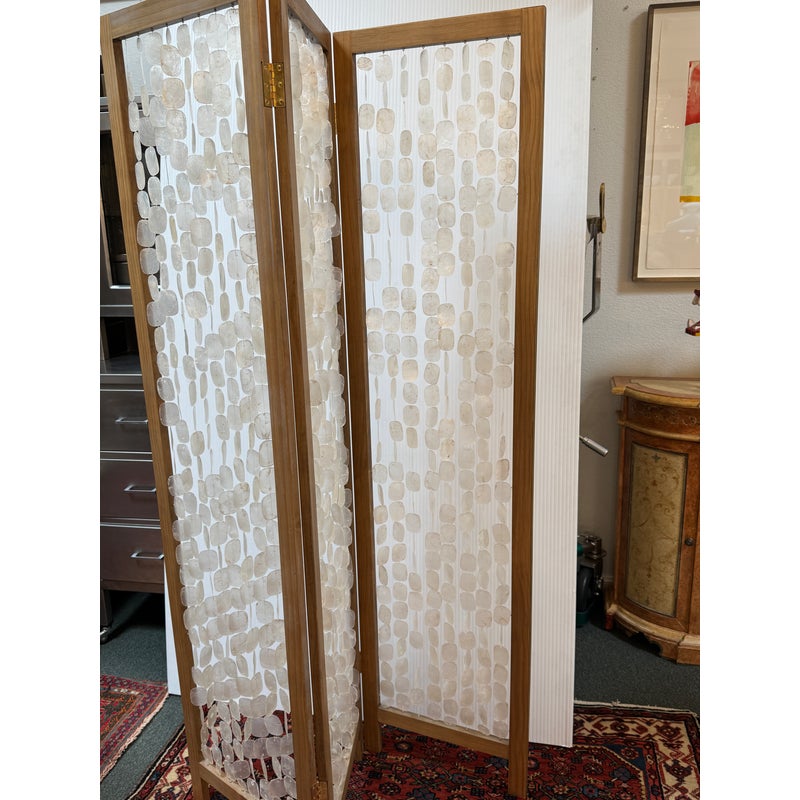 Design Plus Gallery presents a Clear Capiz Screen by Homeroots. A sleek and organic modern 71-inch folding three-panel screen room divider, crafted from elegant capiz shell material, exudes a contemporary aesthetic. This versatile design features three folding panels that can be adjusted to suit your needs, allowing you to define separate areas or create a private dressing area effortlessly. Light surface wear; condition is good.